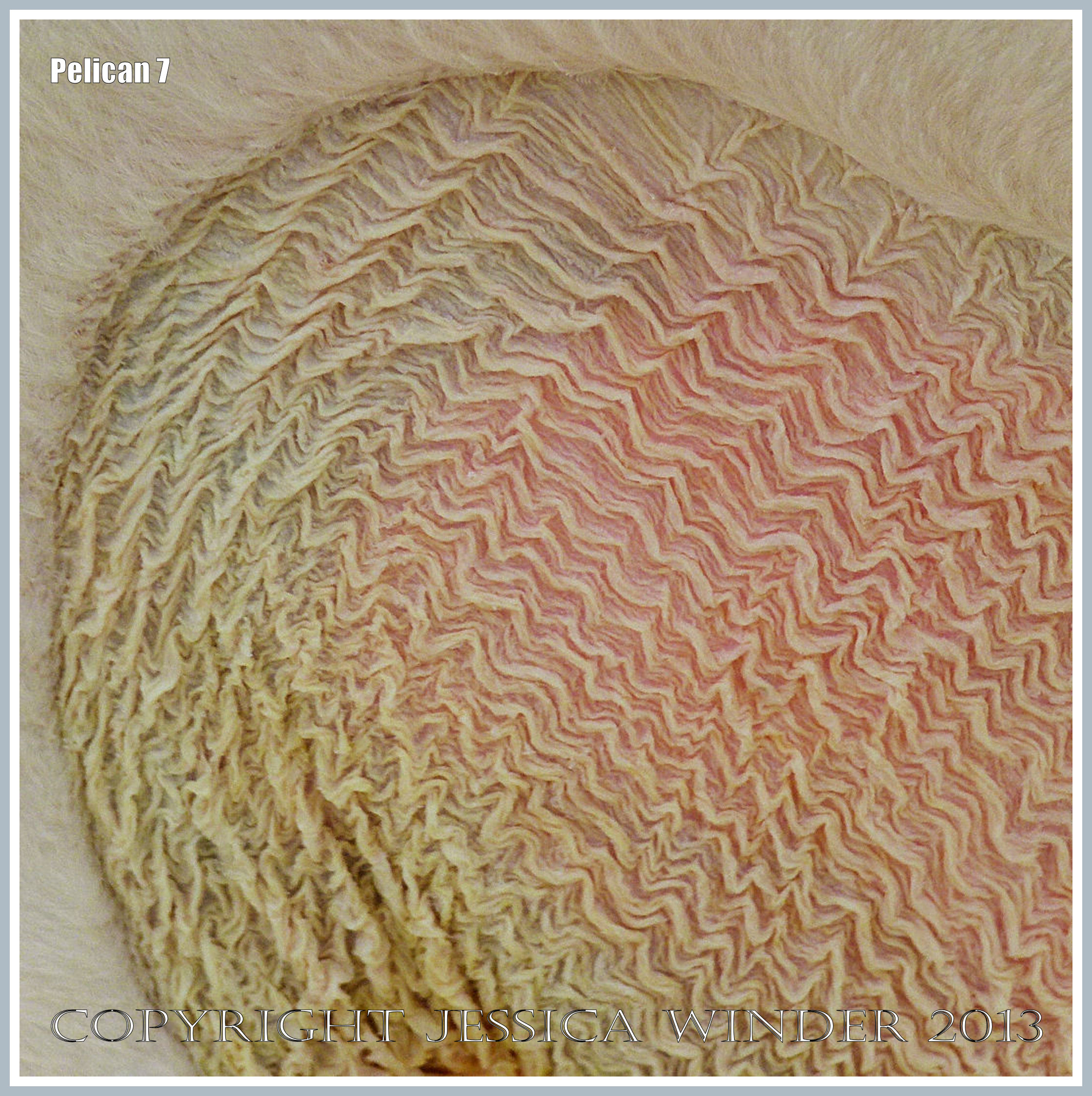 Pelican 7 – Close-up of the pattern of wrinkled skin in the pouch beneath the bill of a pelican which it uses for carrying fish