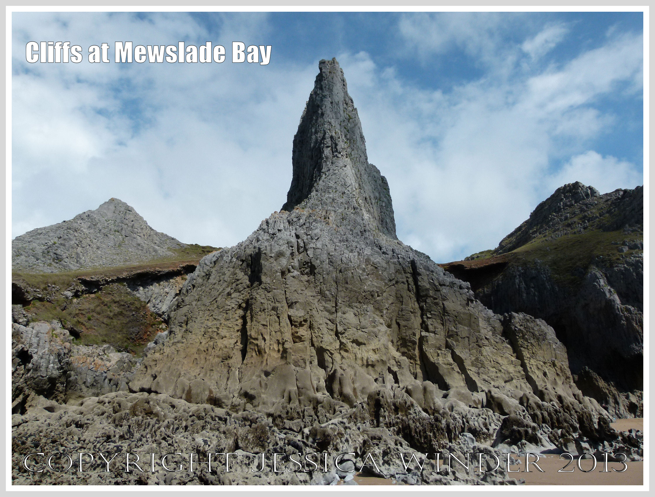 Cliffs at Mewslade Bay (16) Cliffs at Mewslade Bay (16) – Sharp limestone pinnacle looming over Mewslade Bay, Gower, South Wales.