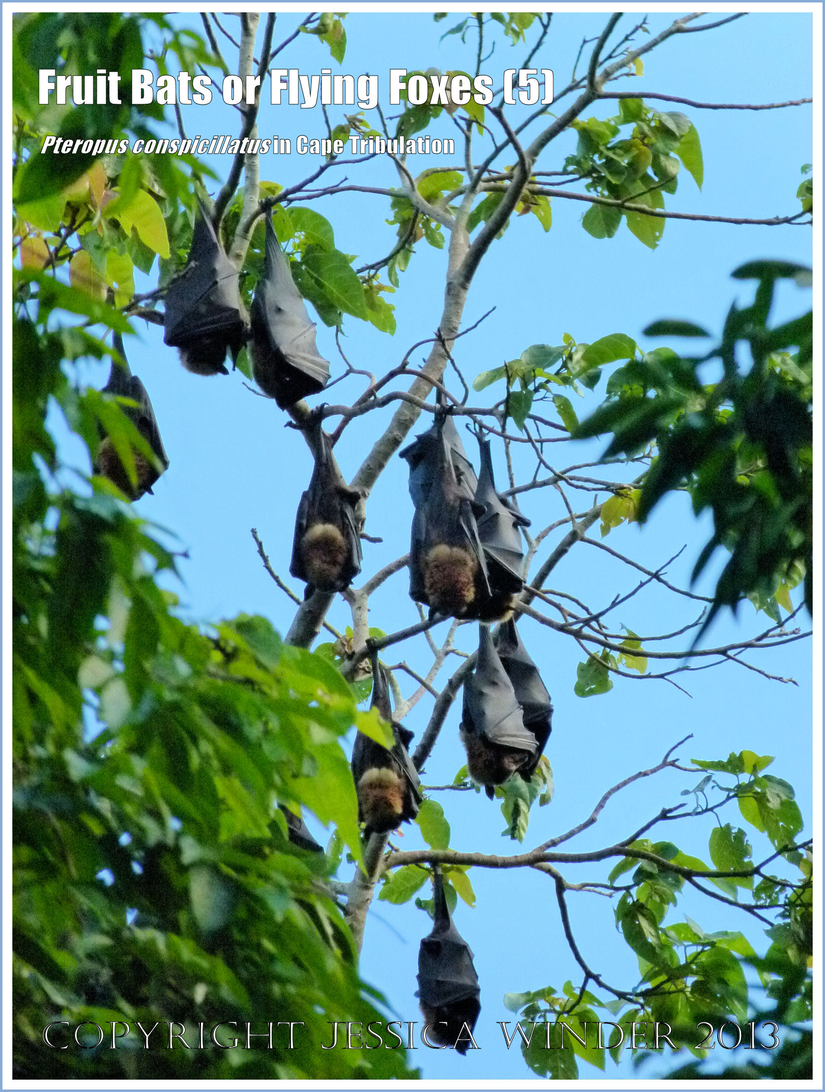 Rainforest Fruit Bats 5 – Spectacled Flying Foxes, Pteropus conspicillatus, roosting in trees of the Daintree rainforest, at Cape Tribulation, Queensland, Australia.