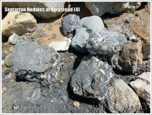 Septarian Nodules at Ringstead (4) – A group of septarian nodule boulders on the beach at Ringstead bay, Dorset, UK