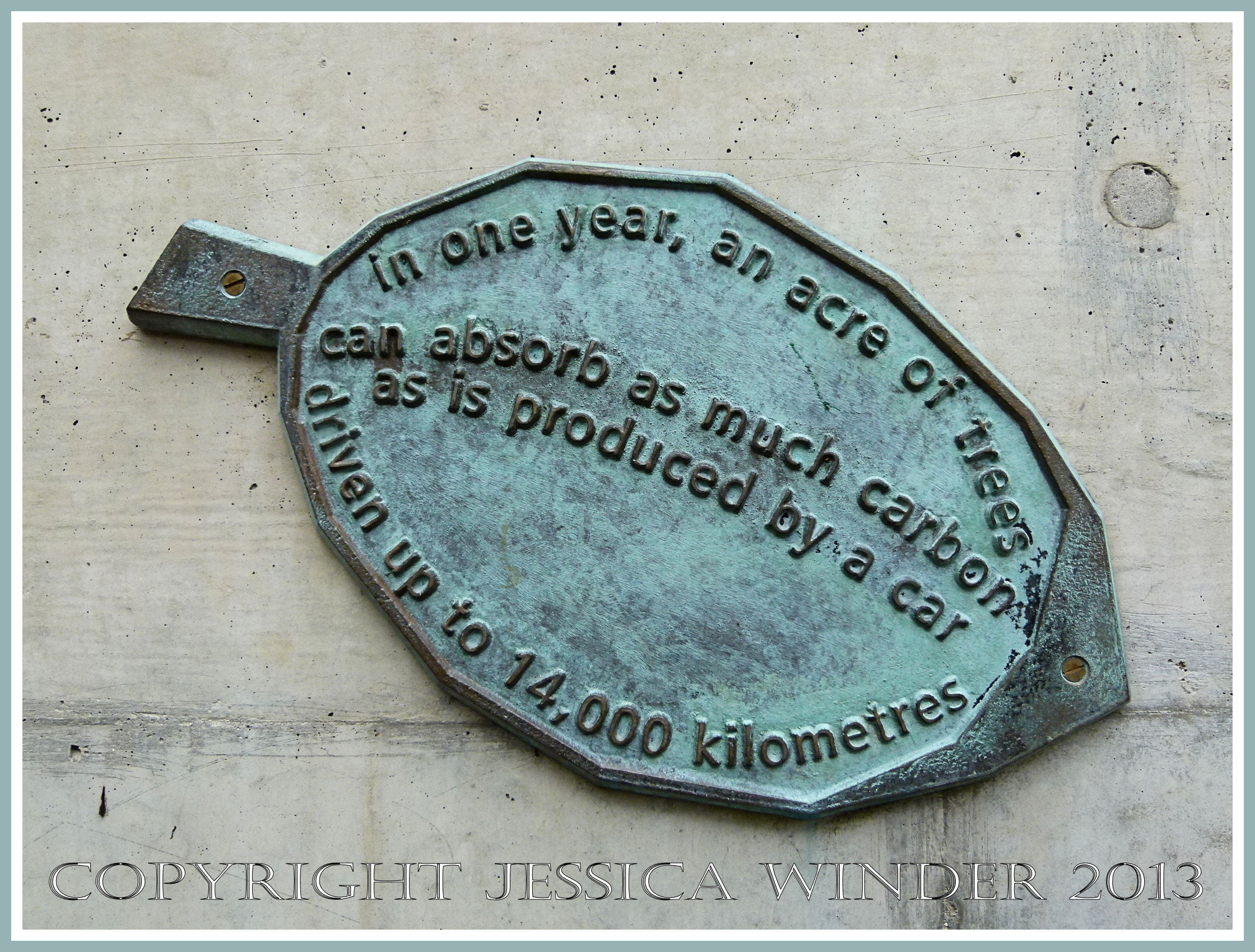 Facts about Trees – Kew Sculpture (5) – Individual leaf plaque, with information about the importance of trees, on a bronze sculpture of a tree at Royal Botanic Gardens, Kew, London.