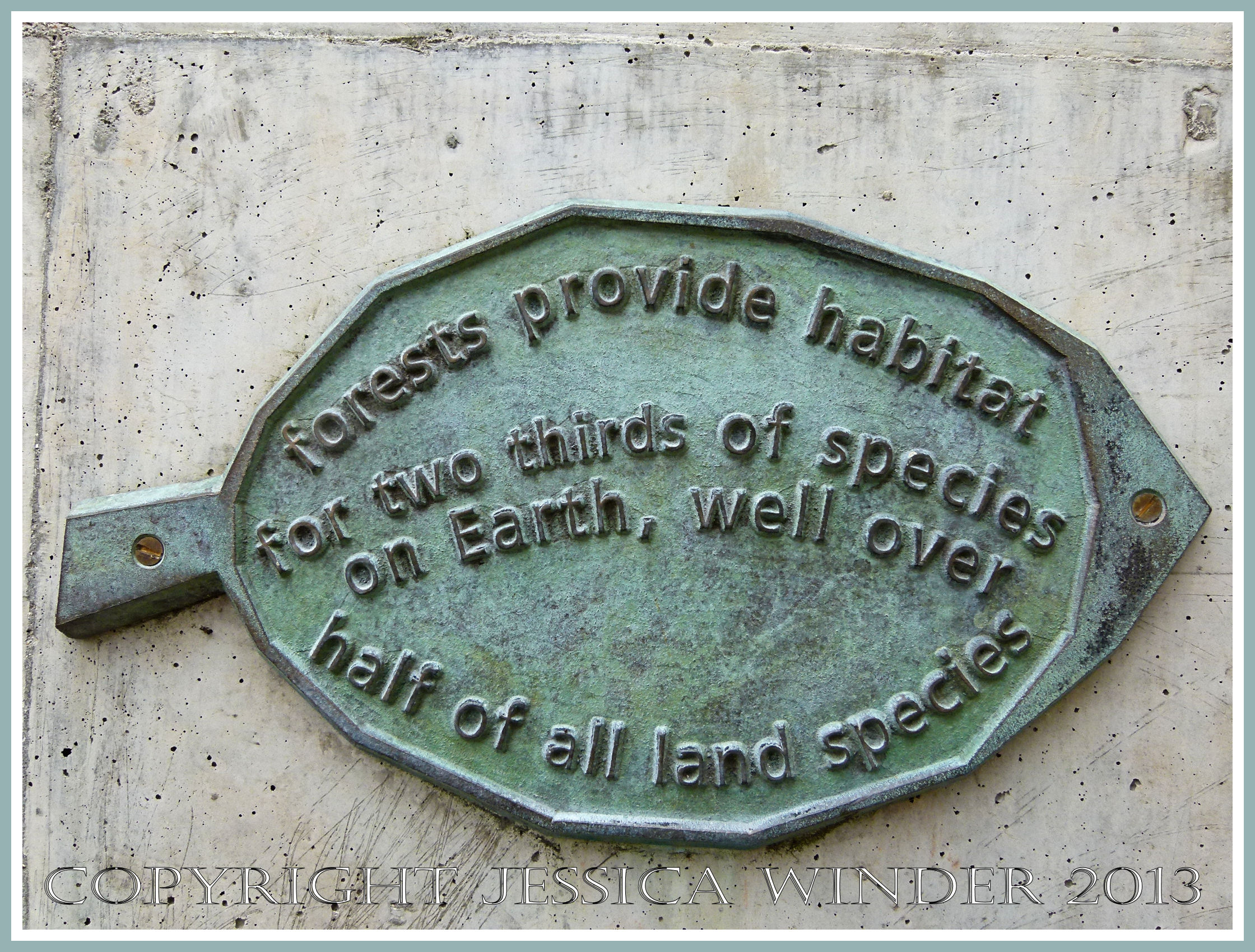 Facts about Trees – Kew Sculpture (8) – Individual leaf plaque, with information about the importance of trees, on a bronze sculpture of a tree at Royal Botanic Gardens, Kew, London.