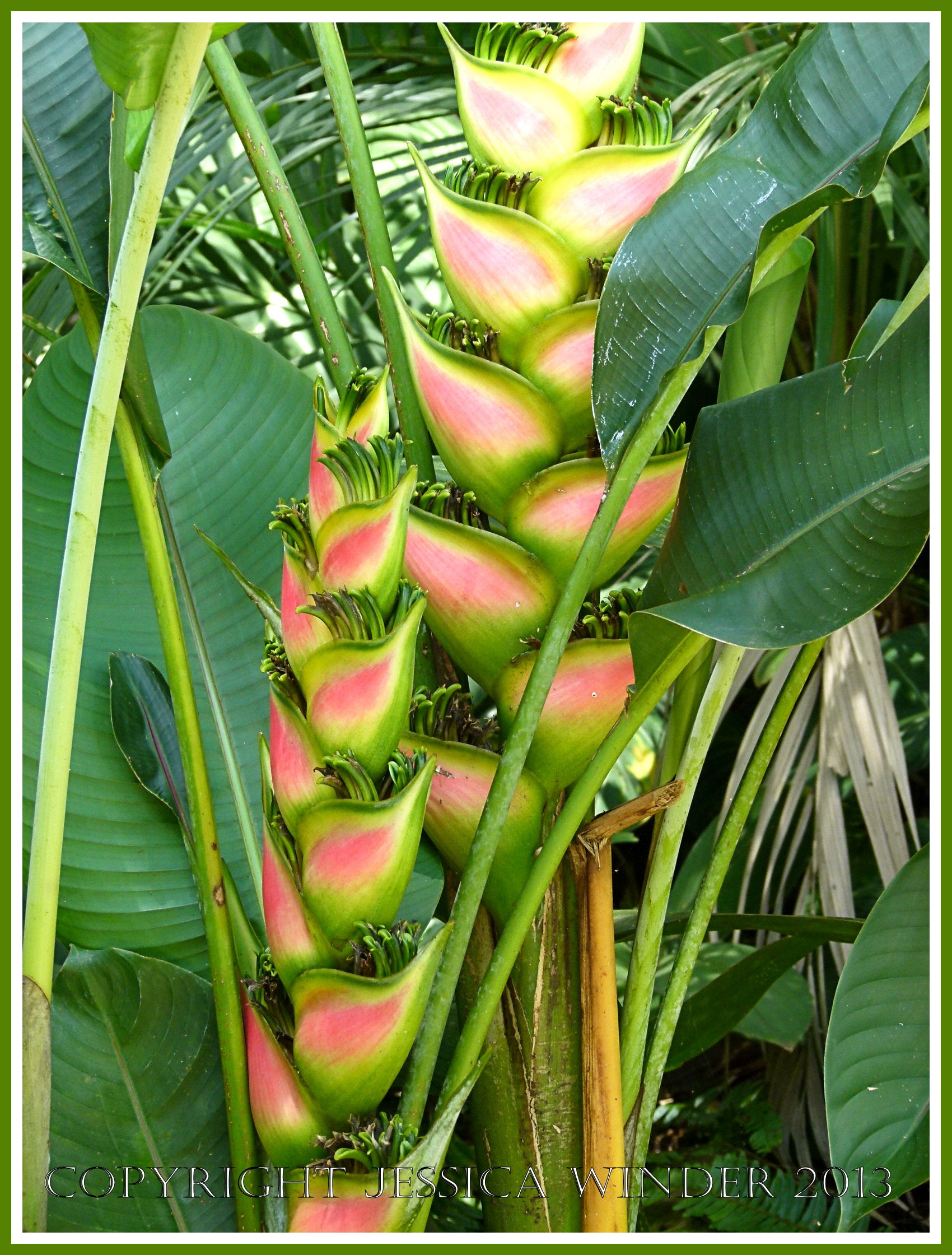 Cairns Botanic Gardens Flowers 2c – Heliconia psittacorum “Sassy” with pink and green leaf-like bracts at the base of the flowers, photographed in Cairns Botanic Gardens in Queensland, Australia.