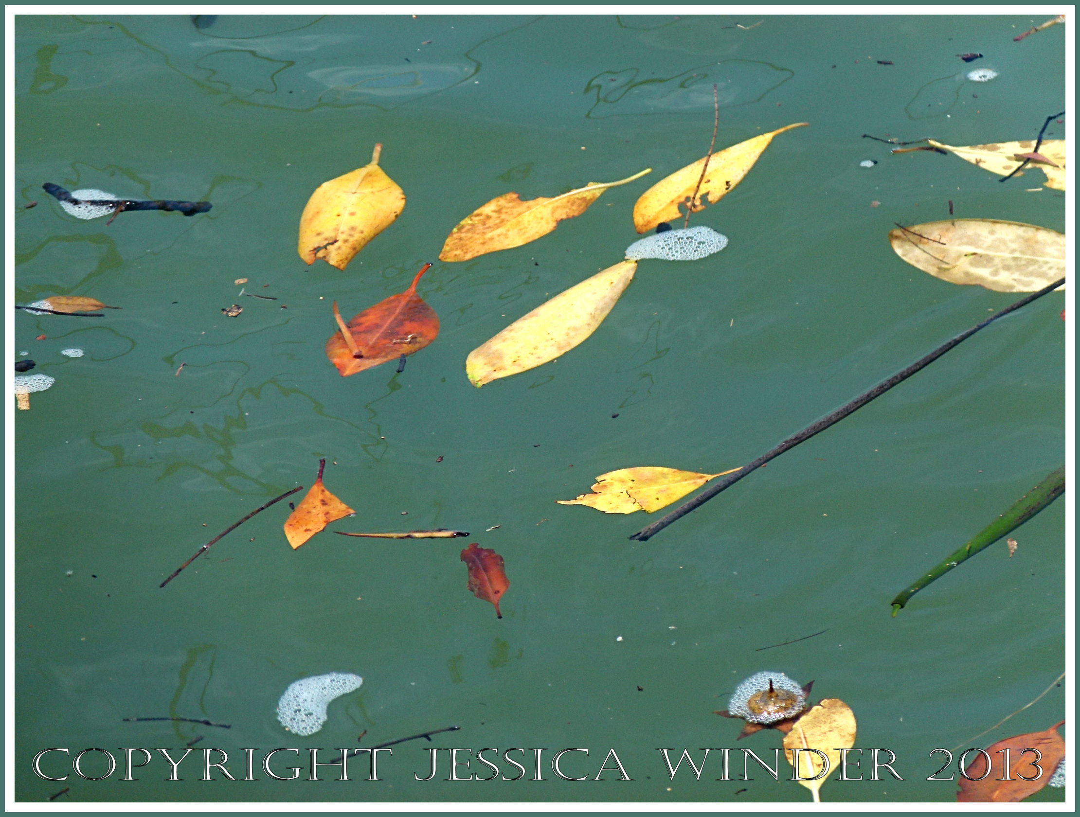 Floating Leaves 1.4 Floating Leaves 1.4 – Brightly coloured dead leaves floating downstream on green water.