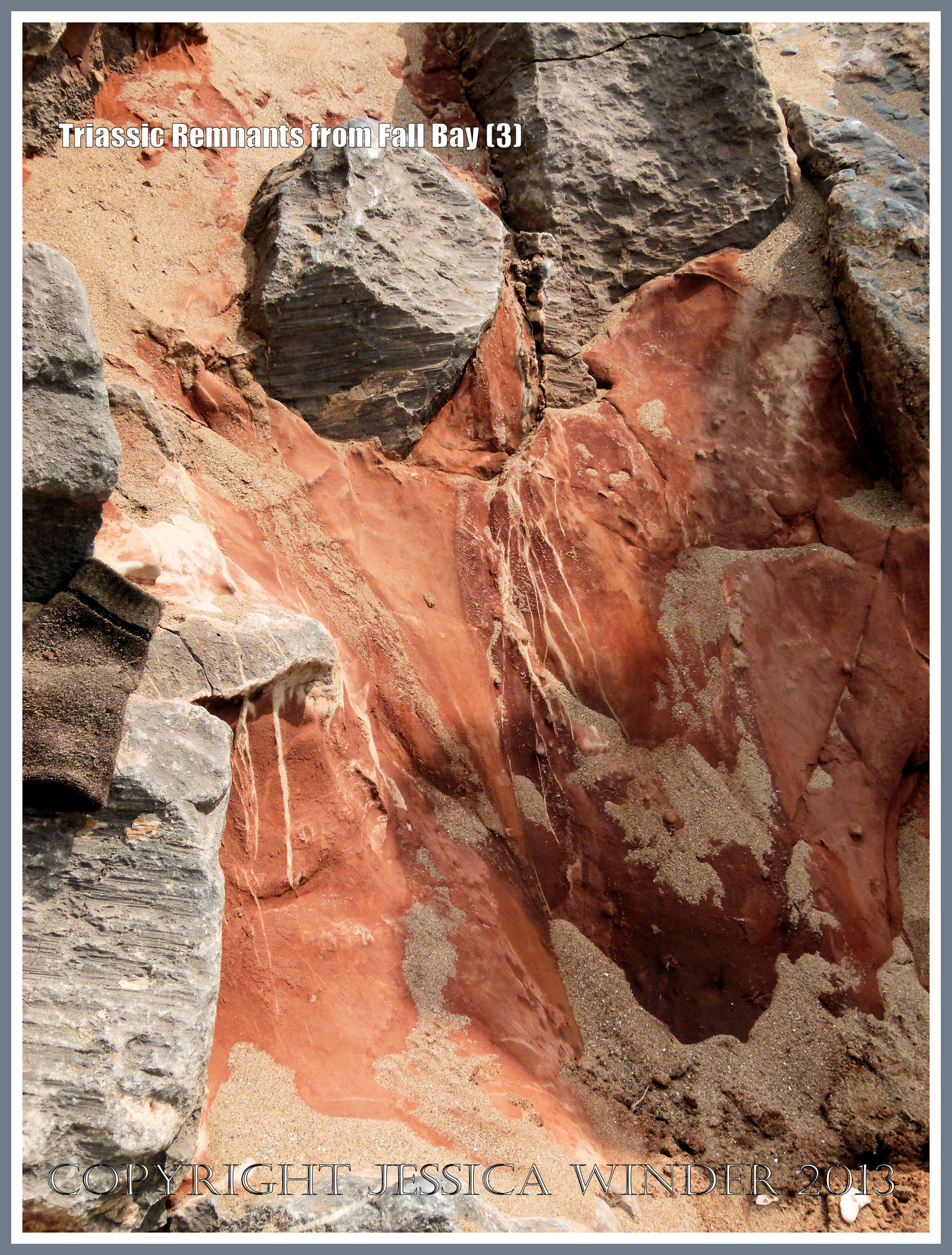 Triassic Remnants at Fall Bay 3 – Red Triassic rock associated with calcite crystals in faults and fractures of earlier Carboniferous limestone strata at the foot of the steps leading to Fall Bay, Gower, South Wales, with enclosed limestone boulders.