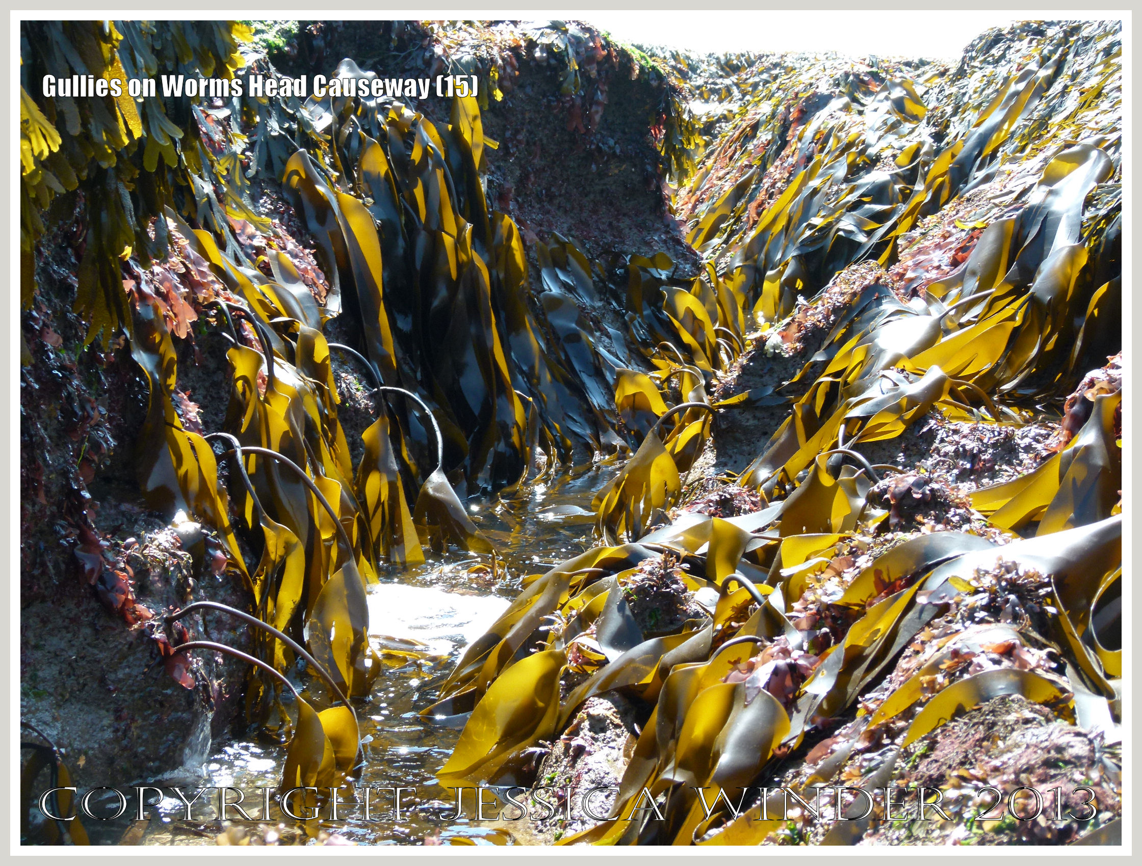 Gullies on Worms Head Causeway 15 – Gully with seaweed in Carboniferous Limestone wave-cut platform called Worms Head Causeway, in Gower, South Wales