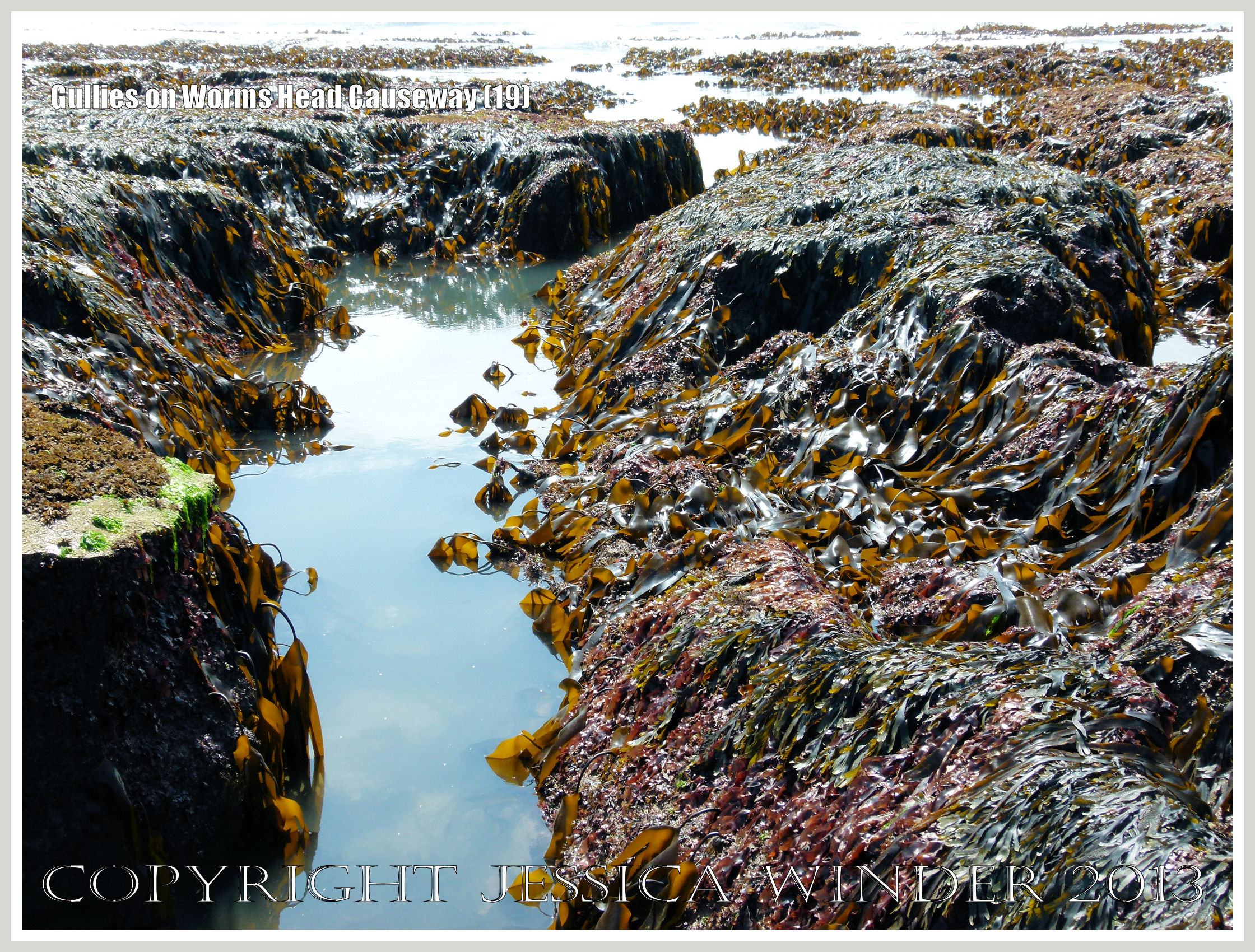 Gullies on Worms Head Causeway 19 – Gully with seaweed in Carboniferous Limestone wave-cut platform called Worms Head Causeway, in Gower, South Wales