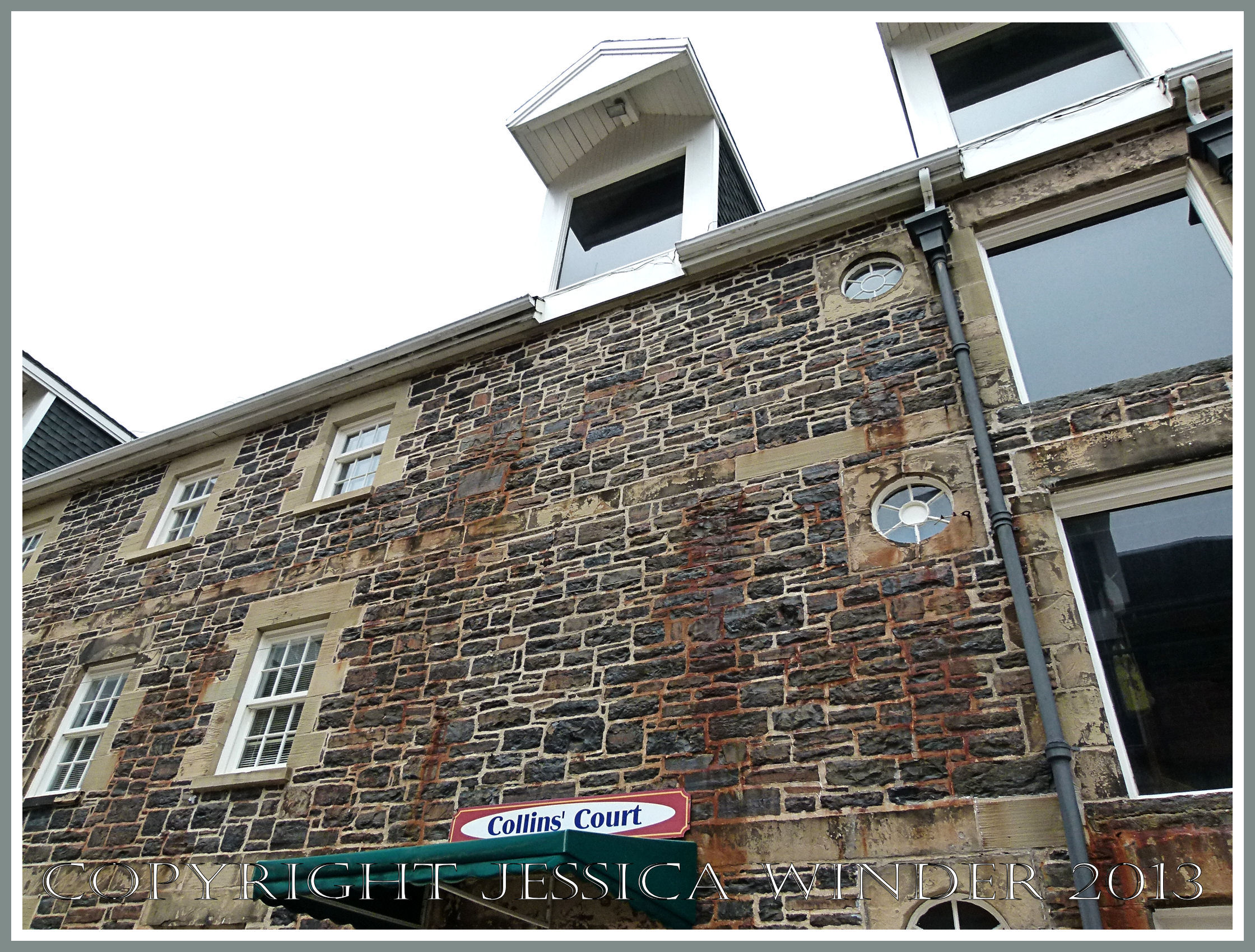 Wall 13 – Building wall constructed from ancient iron-rich meta-sedimentary rocks in one of the restored Historic Properties on the Halifax waterfront, Nova Scotia, Canada.