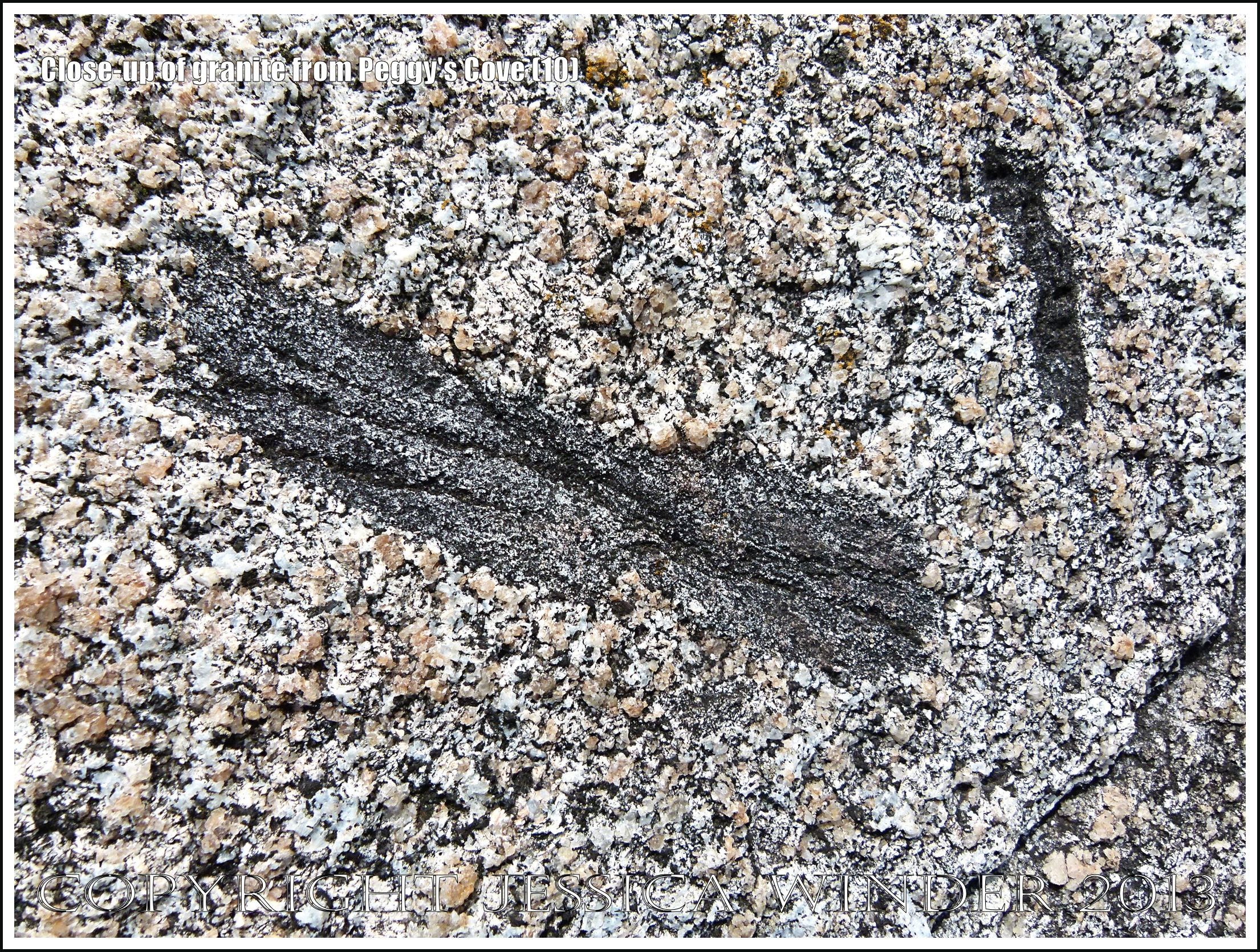 Close-up of granite texture and structure with inclusion or xenolith from glaciated outcrops at Peggy’s Cove, Nova Scotia, Canada.