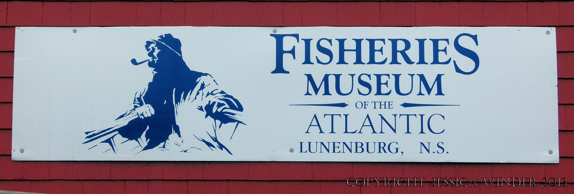 Sign for the Fisheries Museum of the Atlantic in Lunenberg, Nova Scotia, Canada, where the Fin Whale skull is displayed.