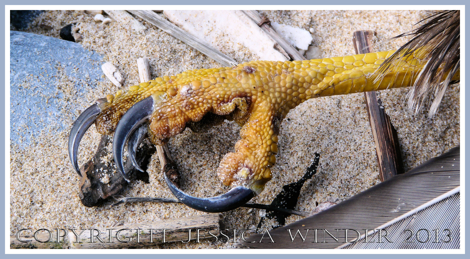 Sad Strandline Bird 1 – Dead bird of prey washed up on the beach as flotsam on the strandline at Oxwich Bay, Gower, South Wales – the foot and talons.