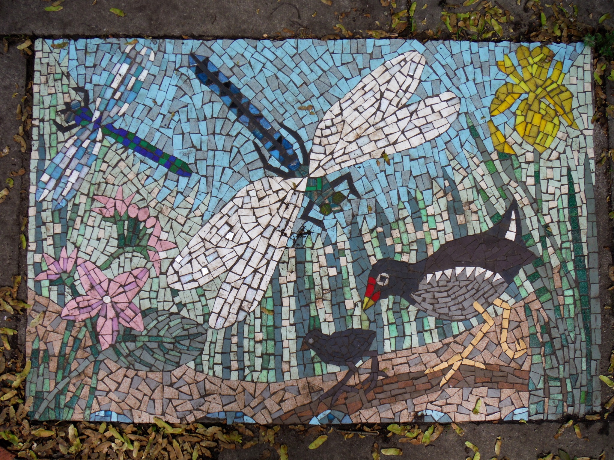 Nature Pavement 5 – Mosaic pavement picture with dragonflies and water birds in Gillespie Road Local Nature Reserve, Islington, London, UK.