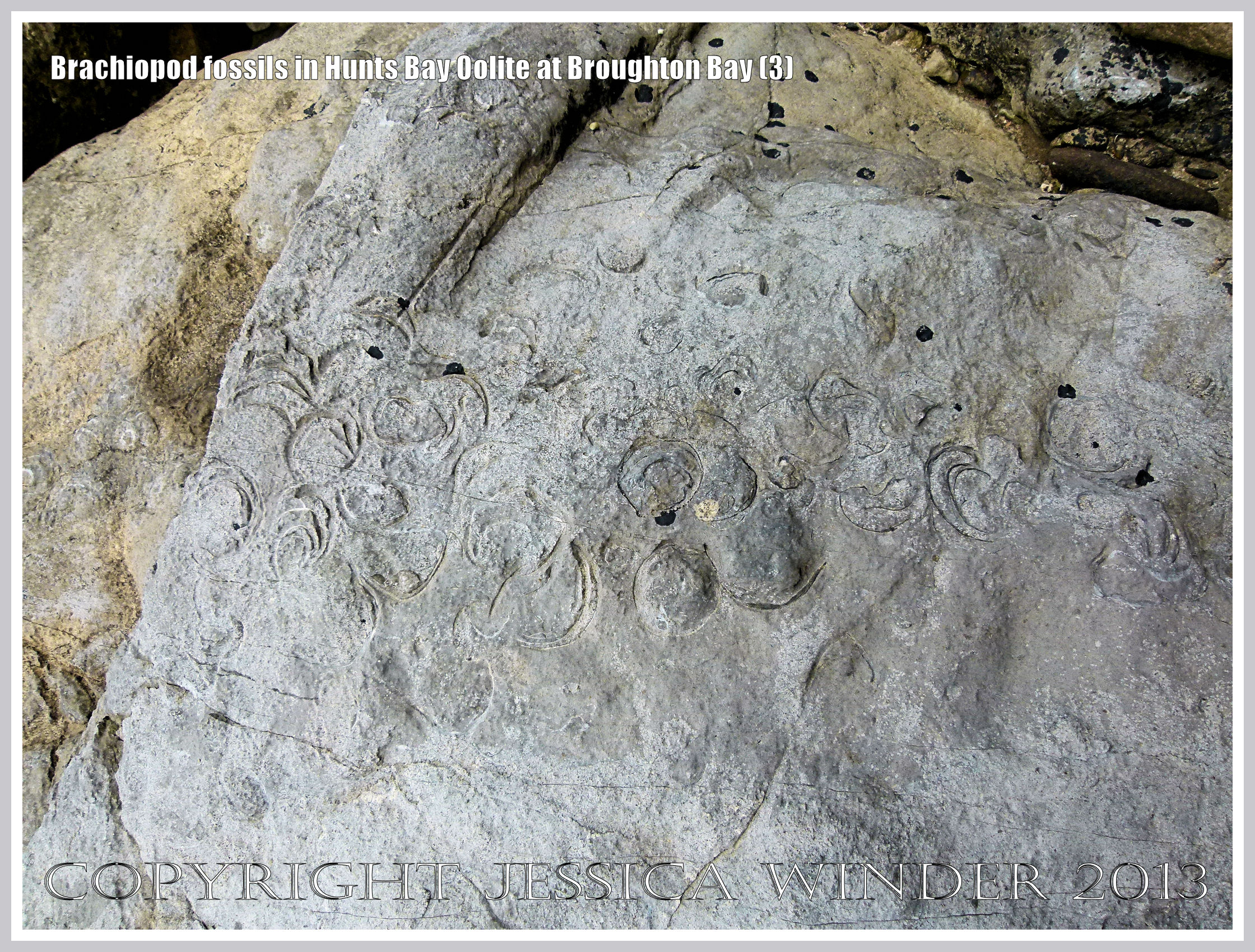 Brachiopods in HBOSG at Broughton Bay 3 – Brachiopod fossils embedded in the Hunts Bay Oolite Subgroup strata of the Carboniferous Limestone rocks at Broughton Bay on the Gower Peninsula in South Wales.