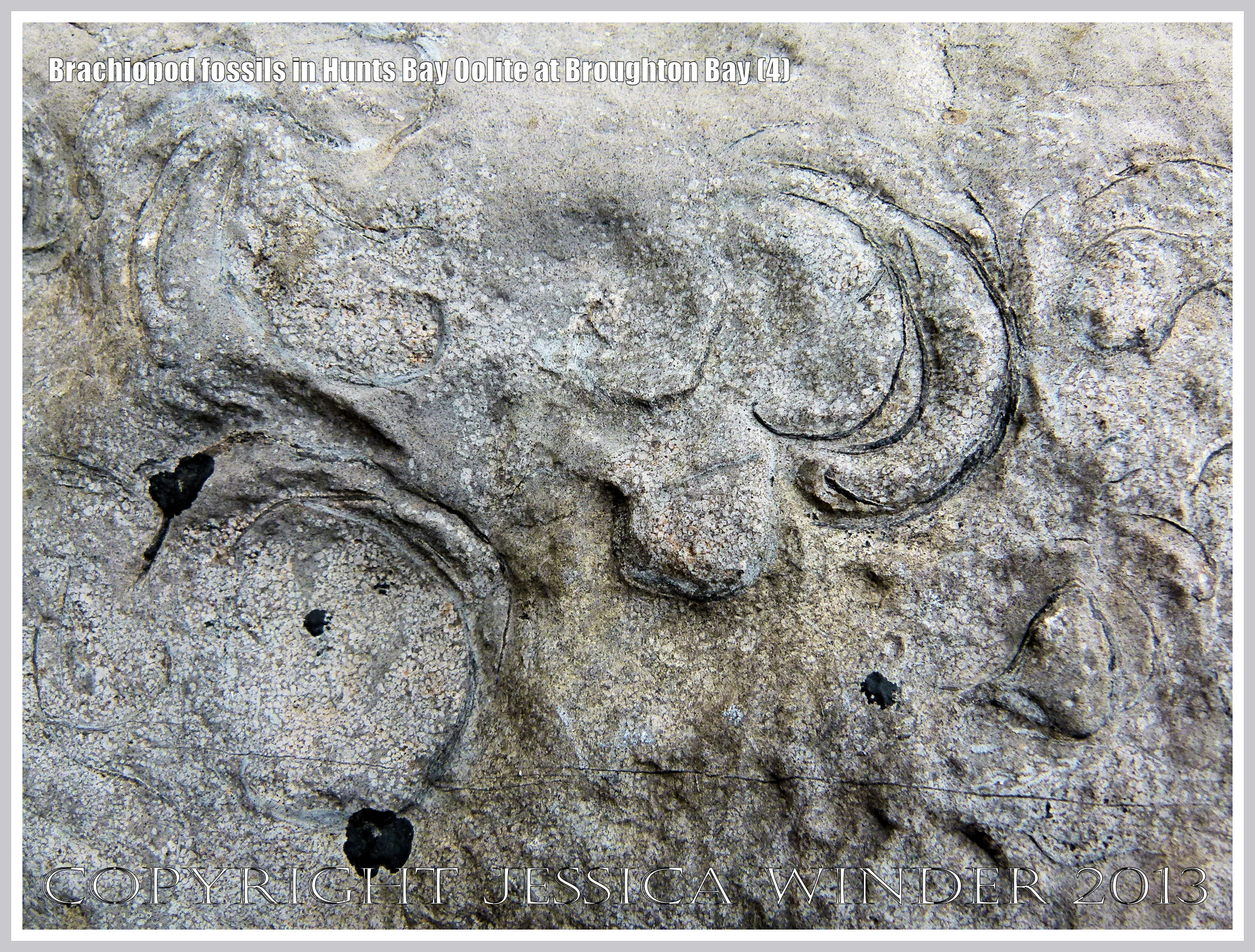 Brachiopods in HBOSG at Broughton Bay 4 – Brachiopod fossils embedded in the Hunts Bay Oolite Subgroup strata of the Carboniferous Limestone rocks at Broughton Bay on the Gower Peninsula in South Wales.