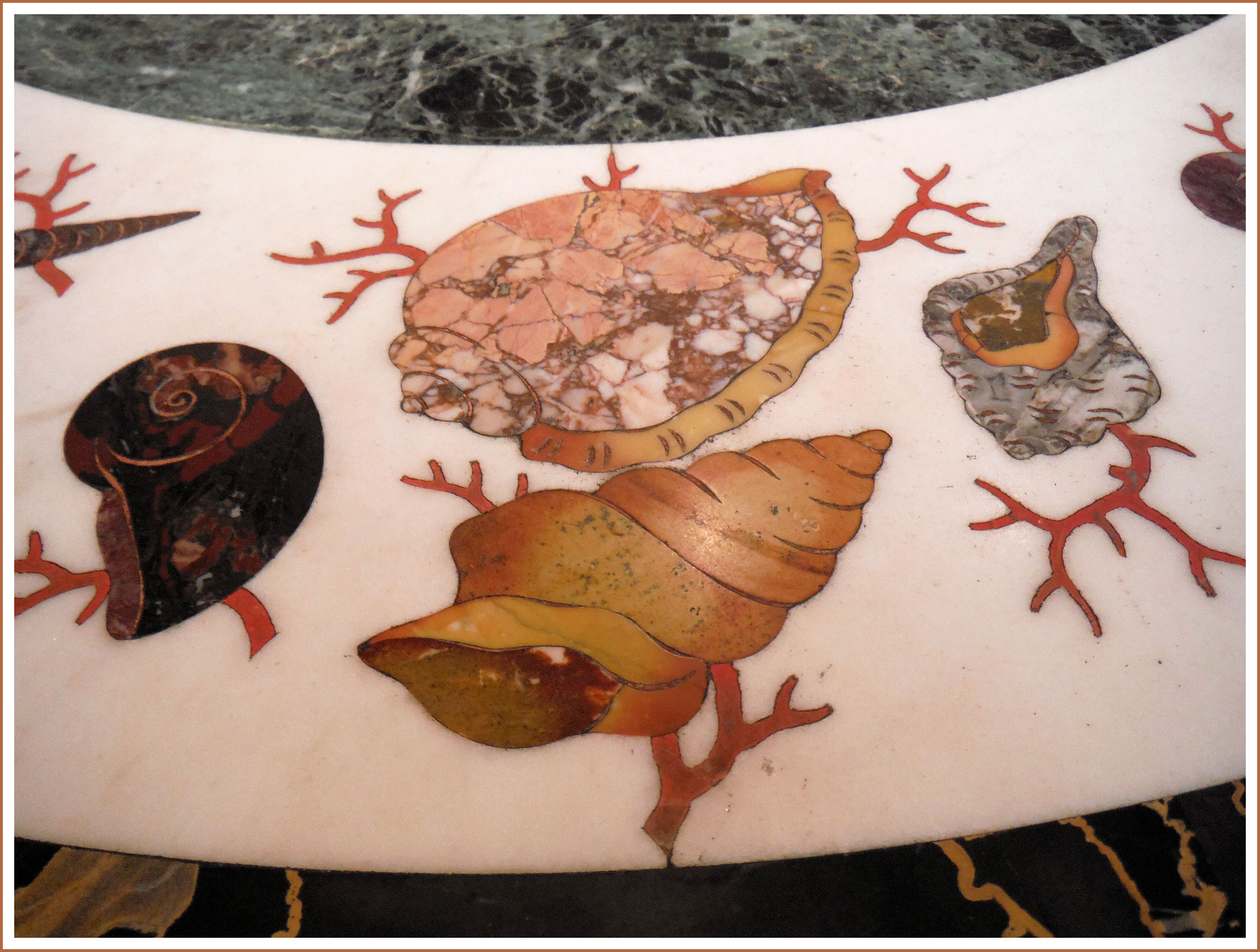 Seashells Made of Stone 1 – Stone seashells decorating a 19th century table top in ‘pietre dure’ style. Made by Florentine workmen using Maltese marble and exhibited in the V&A Museum in London.