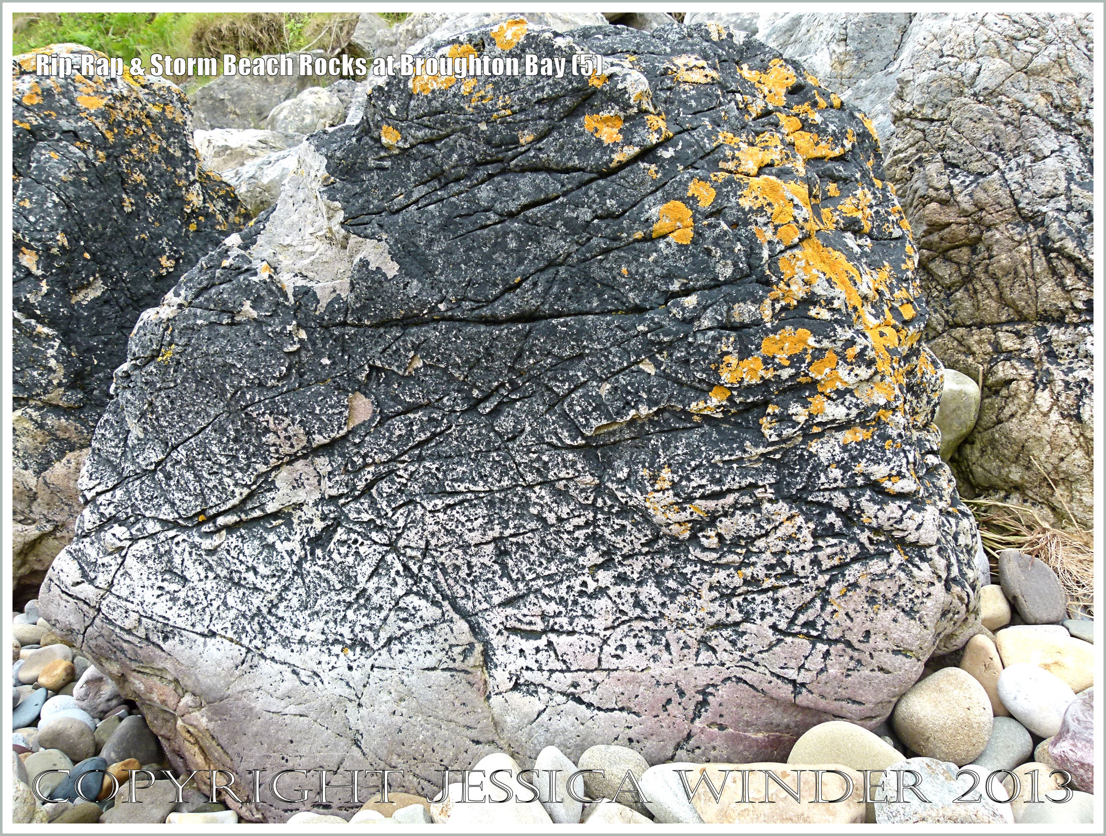 Rip-Rap & Storm Beach Rocks at Broughton Bay 5 – Boulders on the beach (mostly Carboniferous Limestone) as a defence against coastal erosion on the west side of Broughton Bay on the Gower Peninsula in South Wales.
