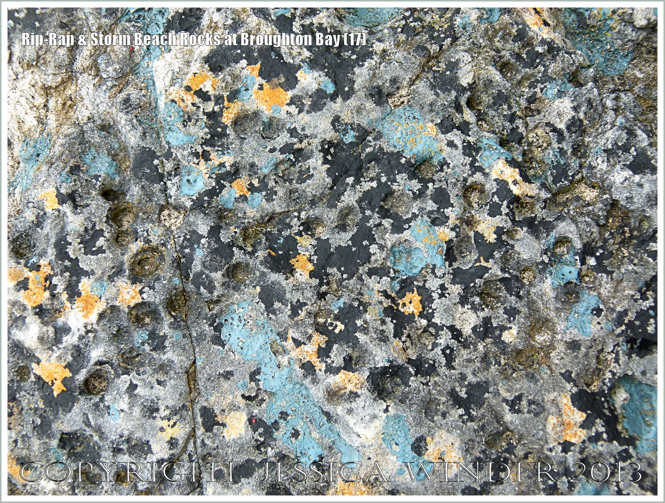 Rip-Rap & Storm Beach Rocks at Broughton Bay 17 – Close-up details of a Carboniferous Limestone boulder, showing splashes of blue paint and black and yellow lichen, on the beach as part of a sea defence system against coastal erosion on the west side of Broughton Bay on the Gower Peninsula in South Wales.