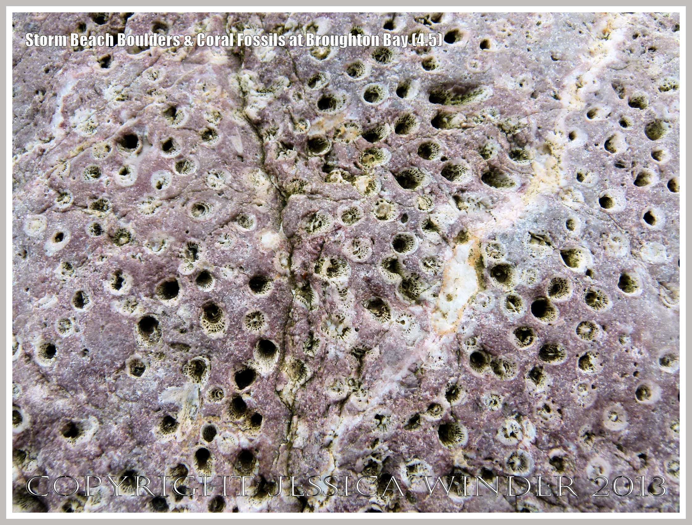 Storm Beach Boulders & Coral Fossils at Broughton 4.5 – Close-up detail of coral fossils in a Carboniferous Limestone boulder at Broughton Bay on the Gower Peninsula in South Wales, mostly seen in cross-section view.