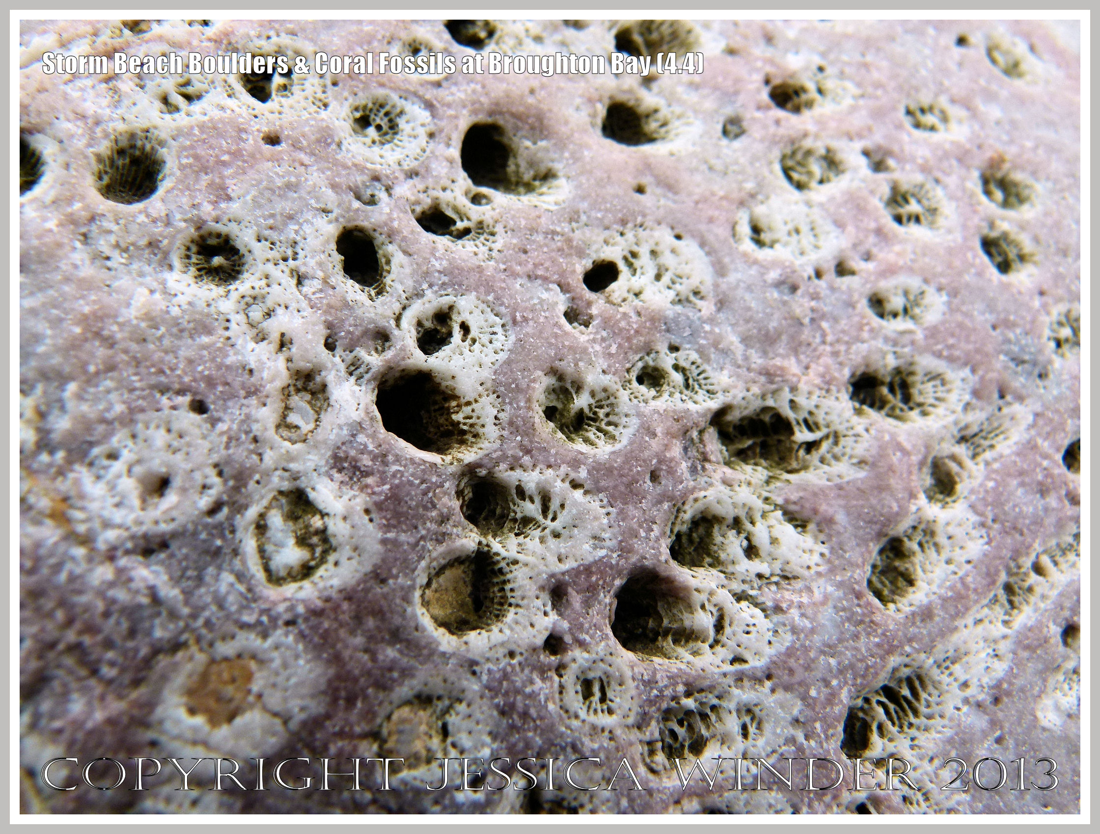 Storm Beach Boulders & Coral Fossils at Broughton 4.4 – Close-up detail of coral fossils in a Carboniferous Limestone boulder at Broughton Bay on the Gower Peninsula in South Wales, mostly seen in cross-section view.