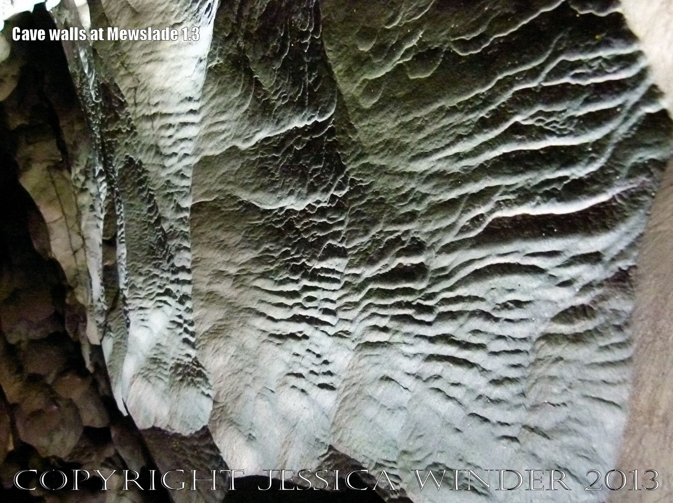 Cave Walls at Mewslade 1.3 – Strange surface texture and patterns, with sub-horizontal parallel shallow grooves and sharp edges on the walls of the inner passages of a cave eroded into High Tor Limestone at Mewslade Bay, Gower, South Wales.