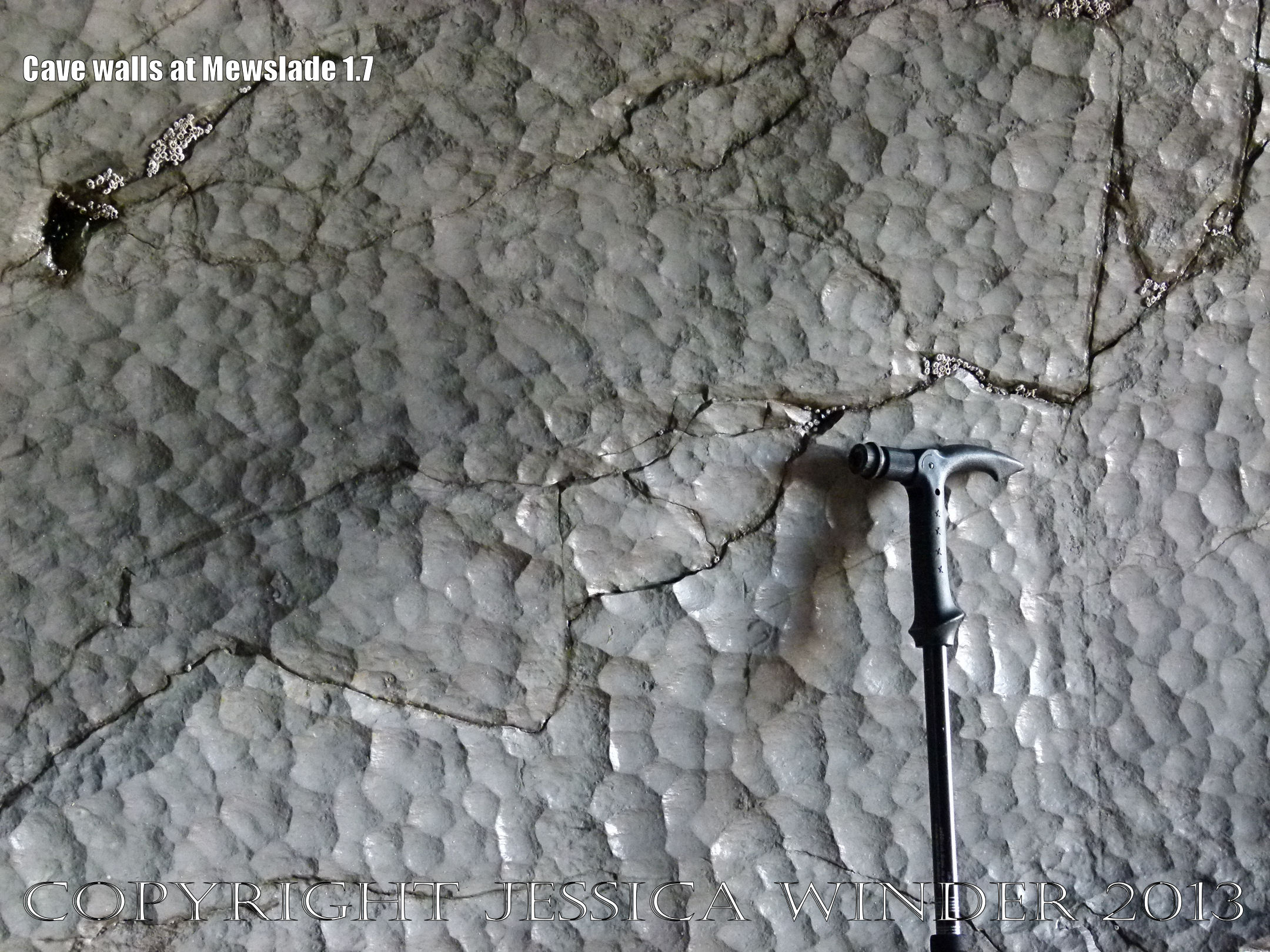 Cave Walls at Mewslade 1.7 – Detail of natural surface sculpture on rock near the entrance to a cave eroded into High Tor Limestone at Mewslade Bay, Gower, South Wales (walking pole used to show scale).