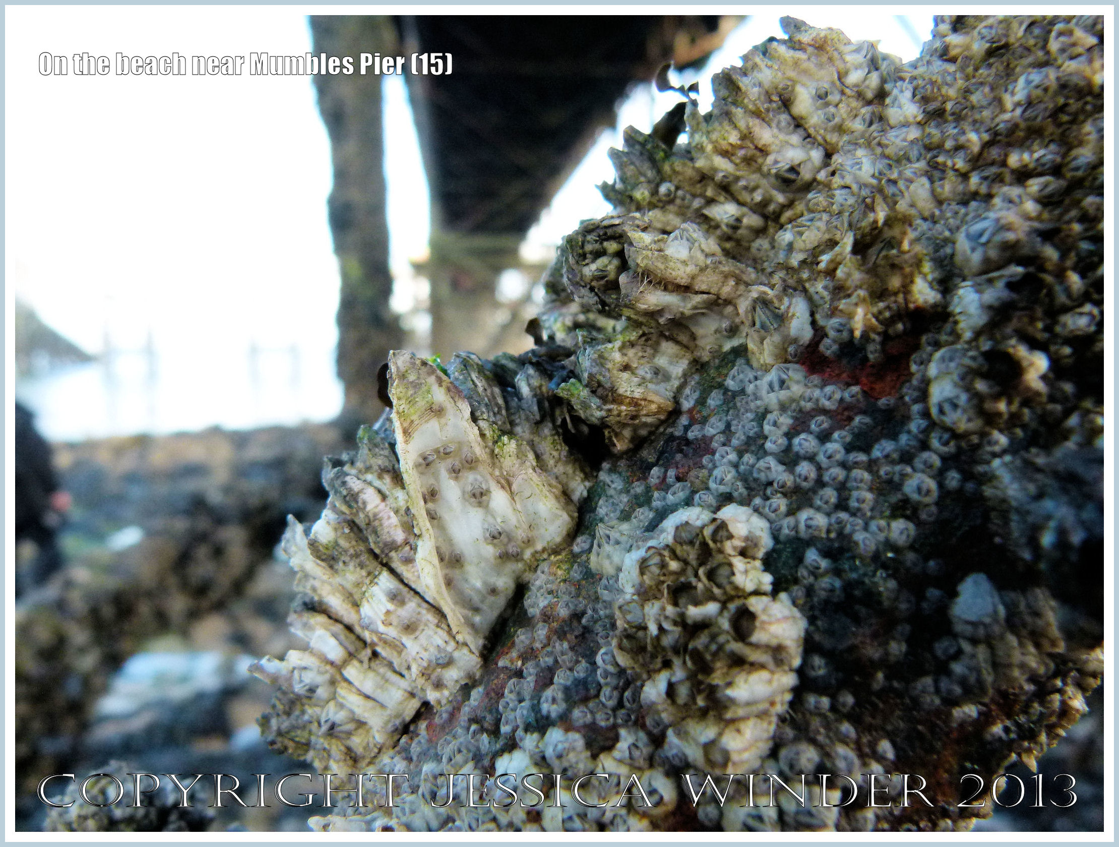 On the beach near Mumbles Pier 15 – Small barnacles growing on larger barnacles on the metalwork beneath Mumbles Pier, near Swansea, South Wales.