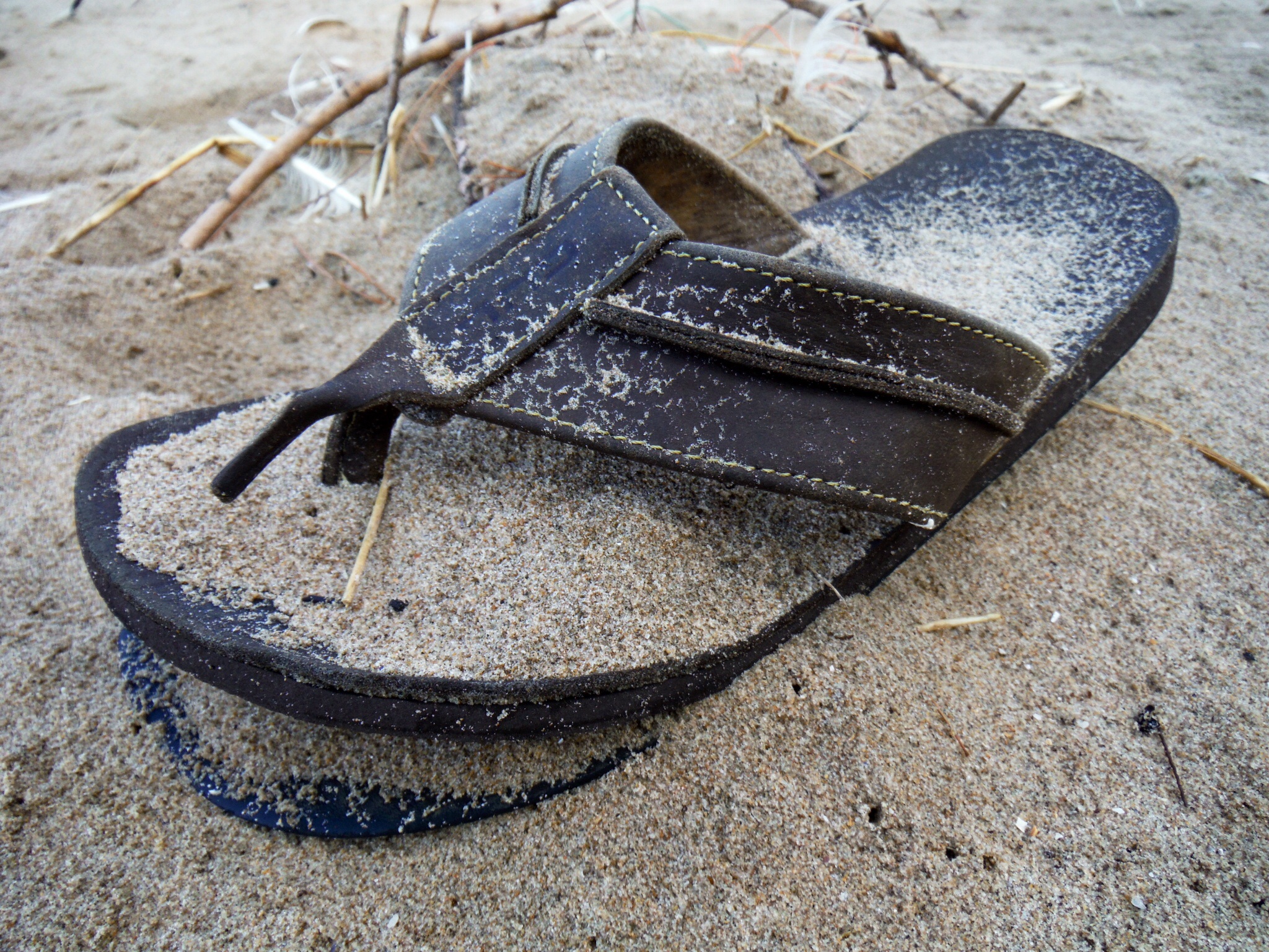 Shoes Washed Ashore 2 Brown leather flip flop or thong on the sandy beach at Rhossili, Gower, South Wales.