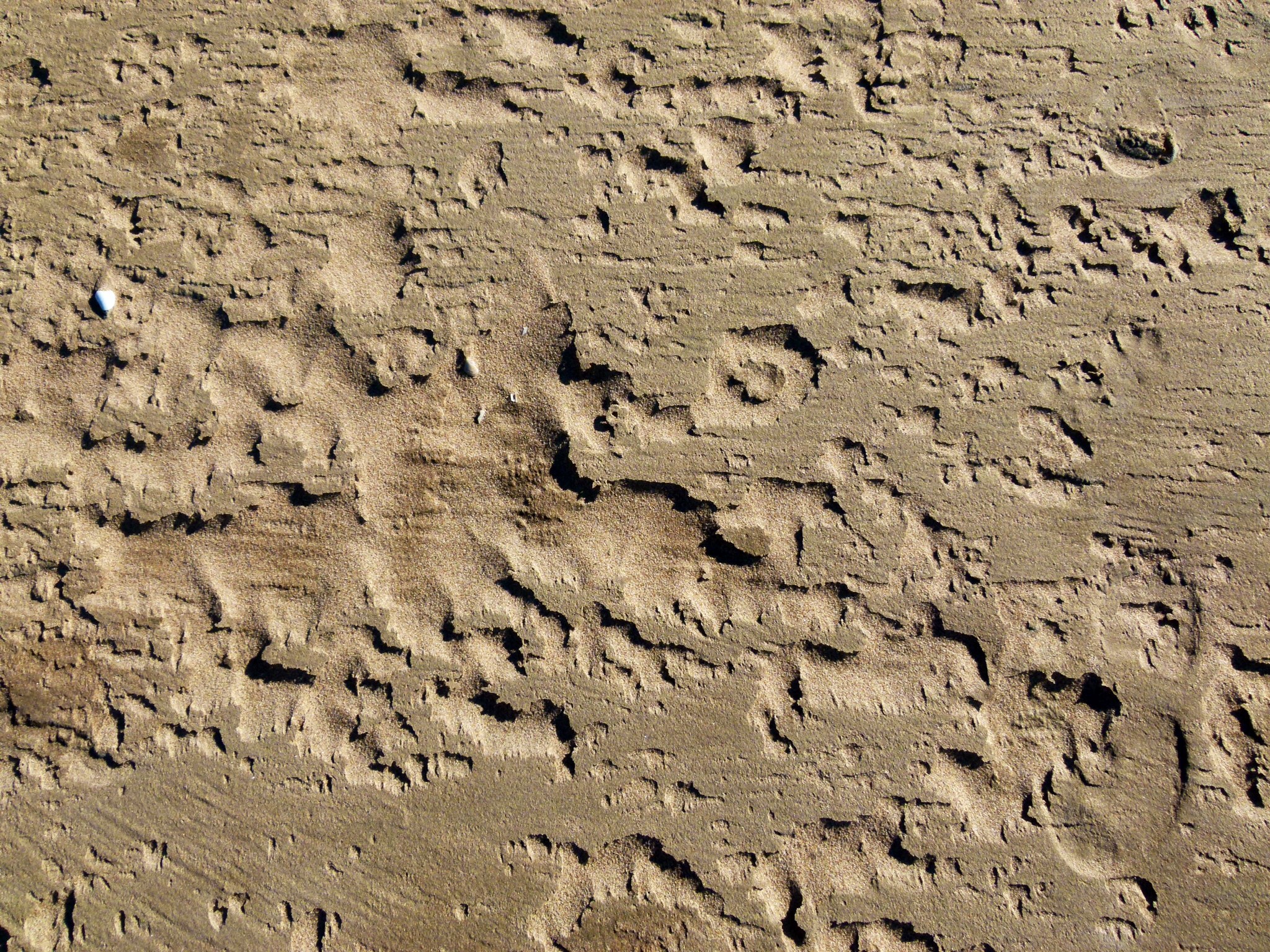 Pattern and texture in compacted beach sand, caused by the scouring action and subsequent deposition of particles by wind-blown sand driven at speed low across the shore at Rhossili, Gower, South Wales.