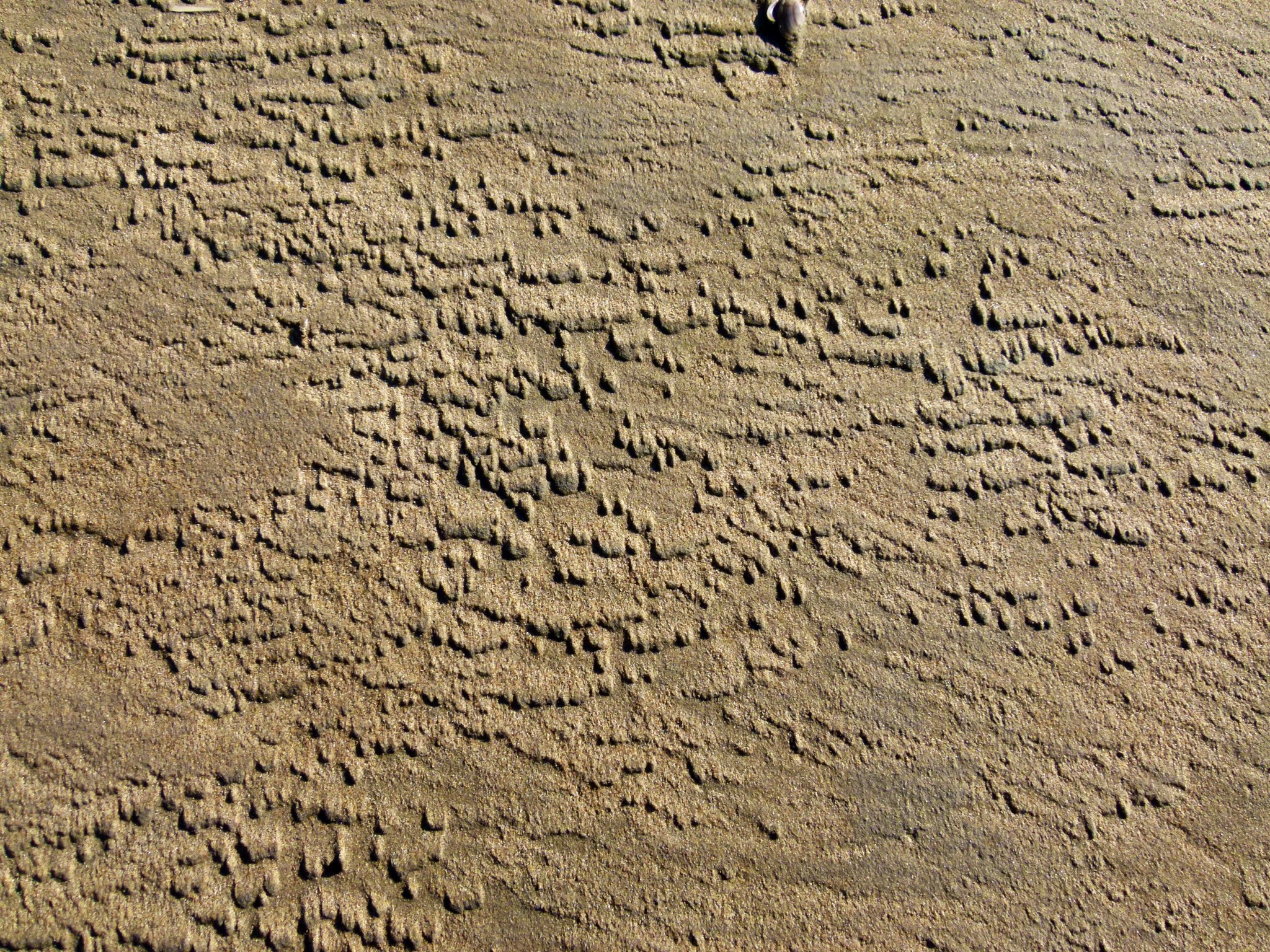 Pattern and texture in compacted beach sand, caused by the scouring action and subsequent deposition of particles by wind-blown sand driven at speed low across the shore at Rhossili, Gower, South Wales.