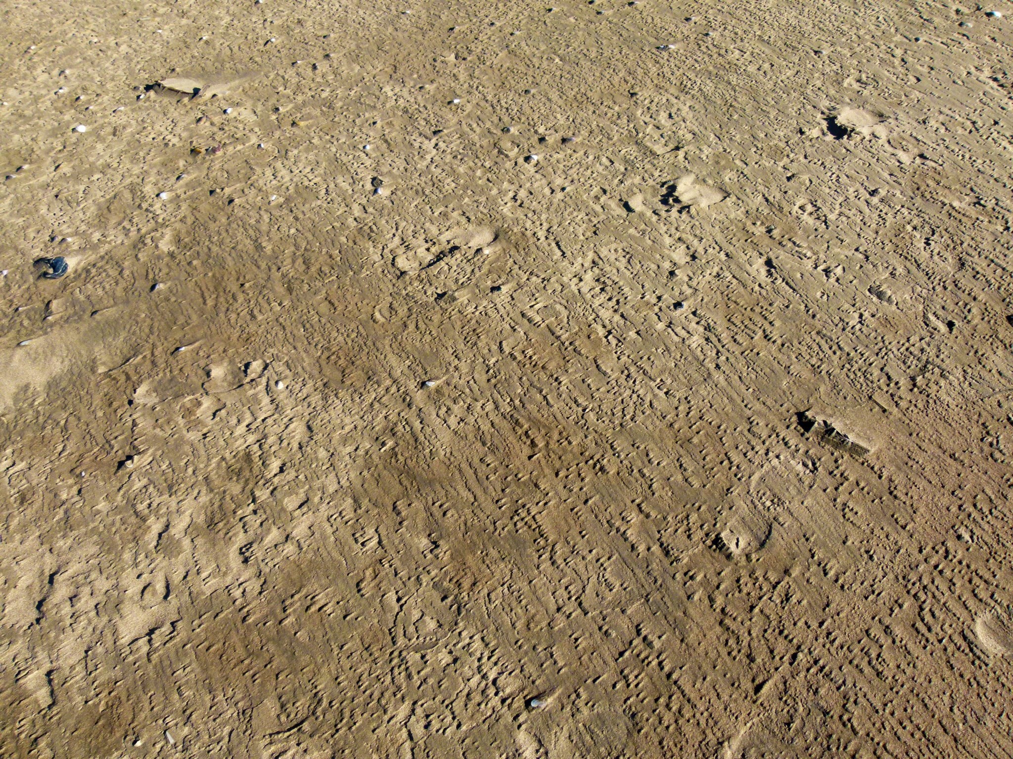 Pattern and texture in compacted beach sand, caused by the scouring action and subsequent deposition of particles by wind-blown sand driven at speed low across the shore at Rhossili, Gower, South Wales.