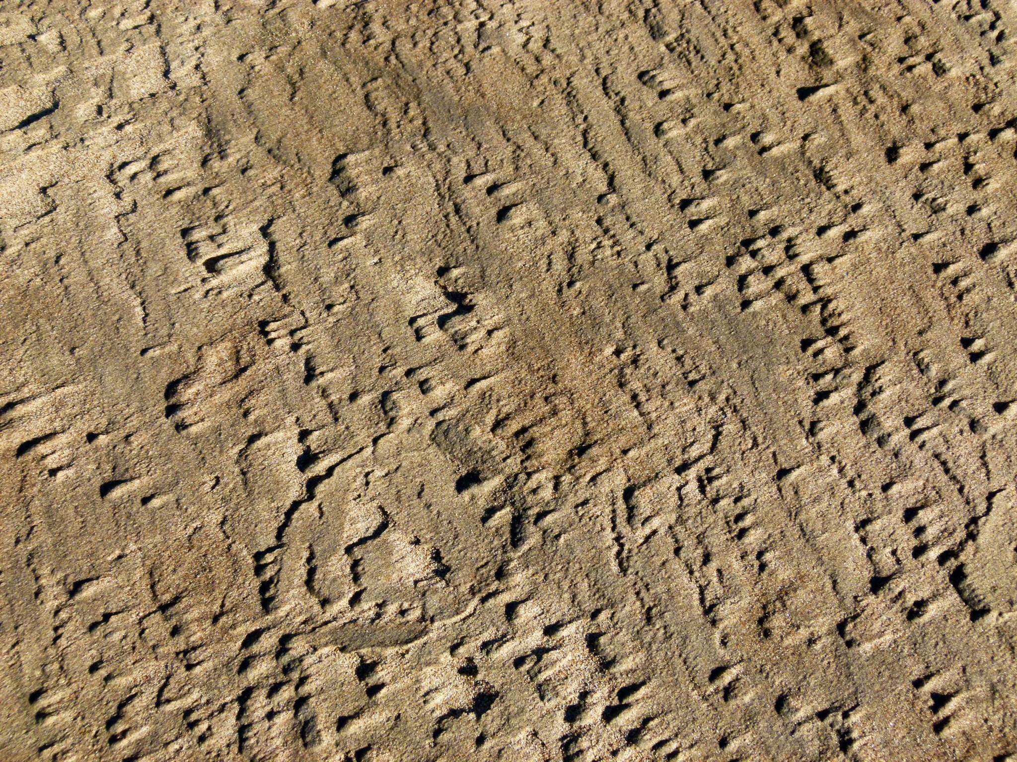 Pattern and texture in compacted beach sand, caused by the scouring action and subsequent deposition of particles by wind-blown sand driven at speed low across the shore at Rhossili, Gower, South Wales.