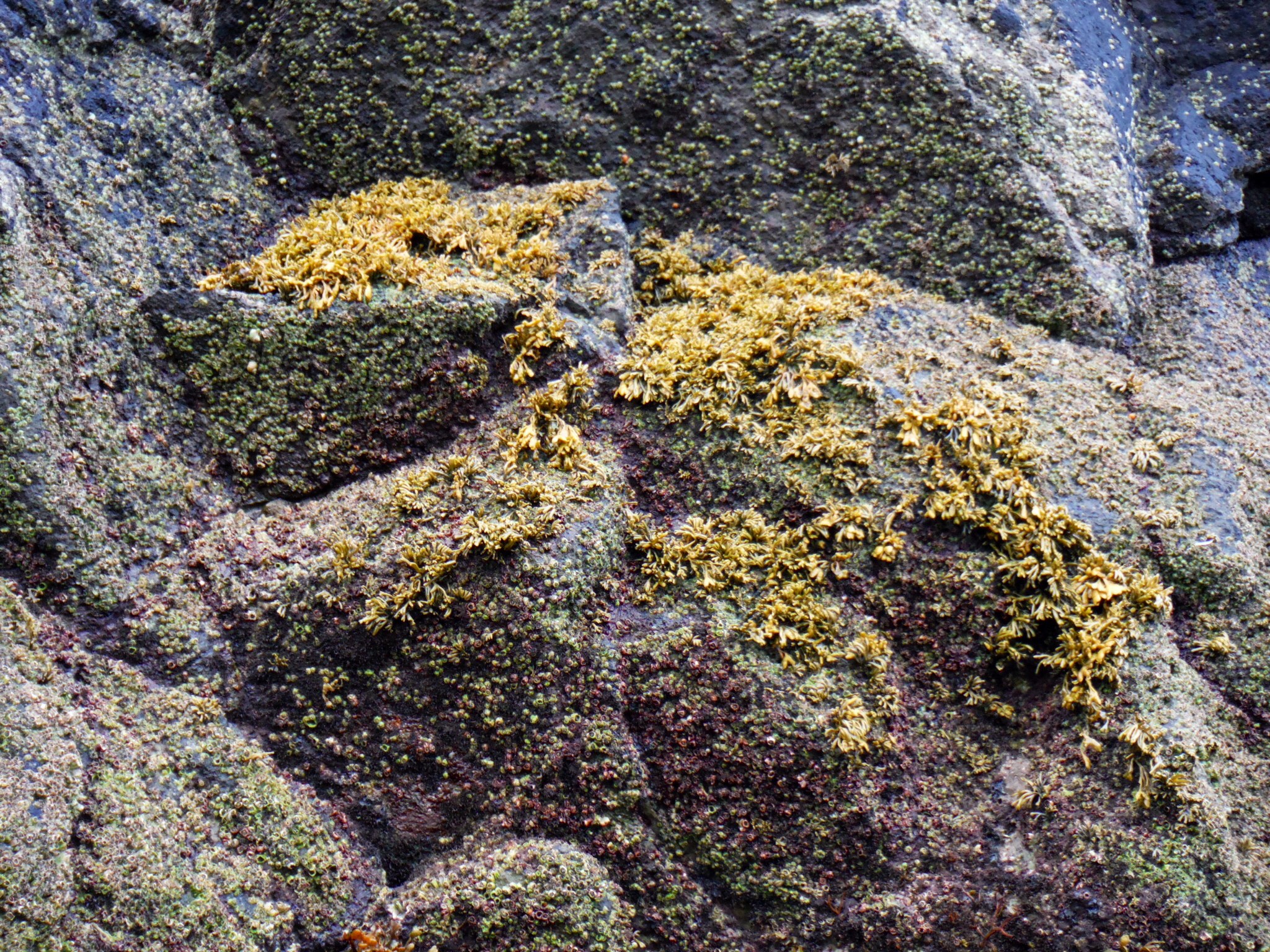 Seaweed growing on the Carboniferous Limestone strata (Black Rock Limestone Subgroup) of the cliff face of the Rhossili headland on the south side of Rhossili Bay in Gower, South Wales.