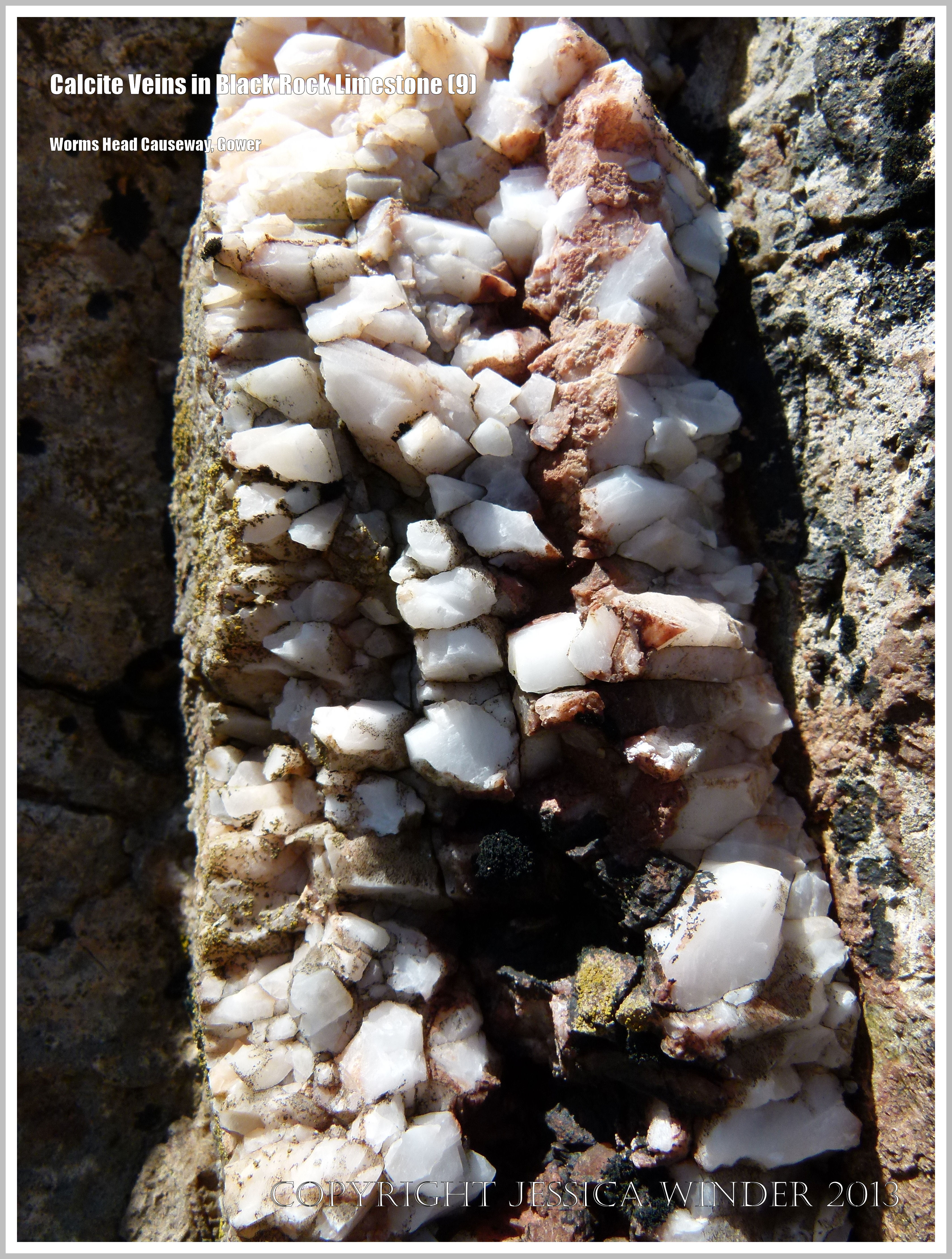Calcite Veins in Black Rock Limestone 9 – White crystalline calcite with red haematite in Carboniferous Period rocks at Worms Head Causeway, Gower, South Wales.