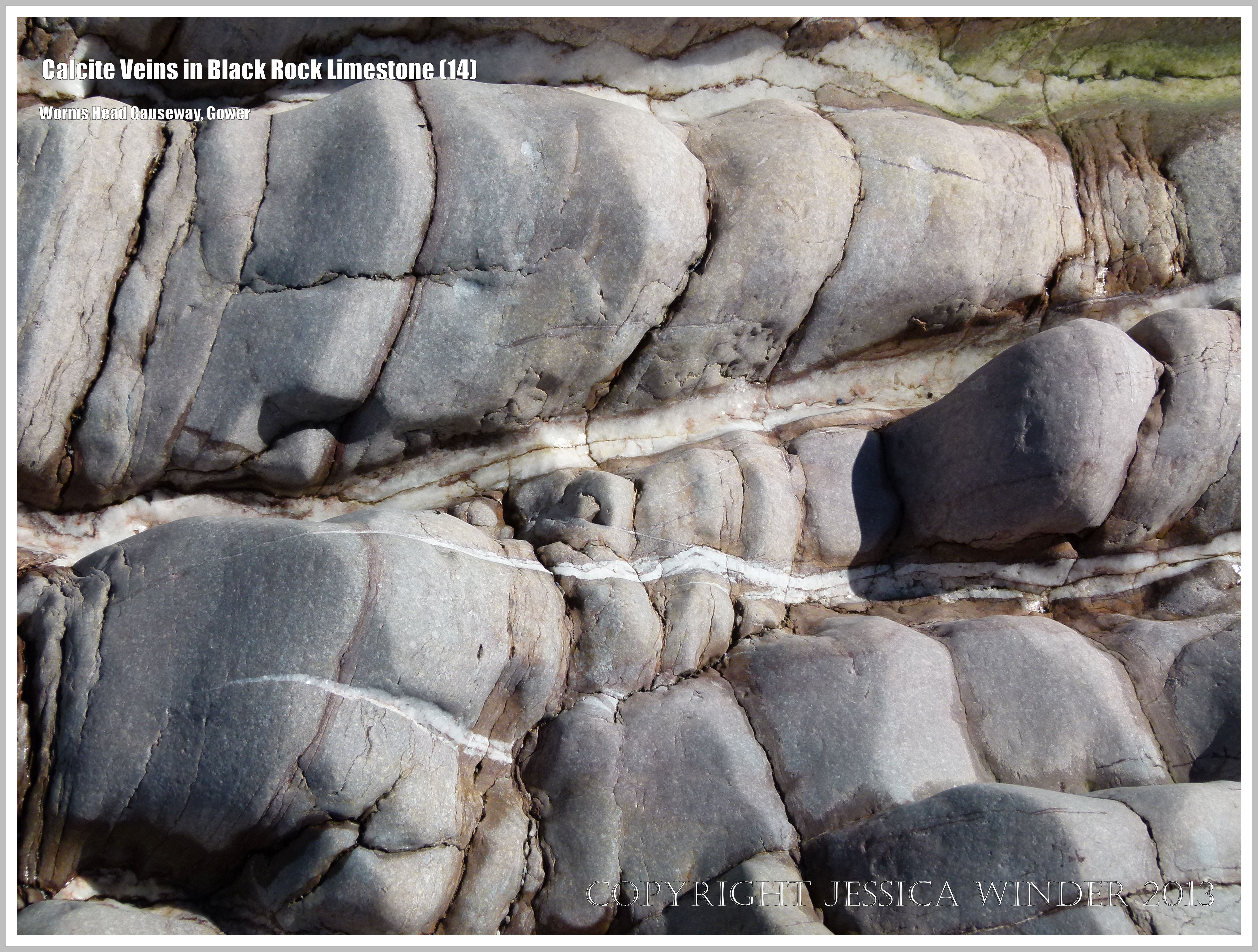 Calcite Veins in Black Rock Limestone 14 – White crystalline calcite cutting across the strata of Carboniferous Period limestone rocks at Worms Head Causeway, Gower, South Wales.