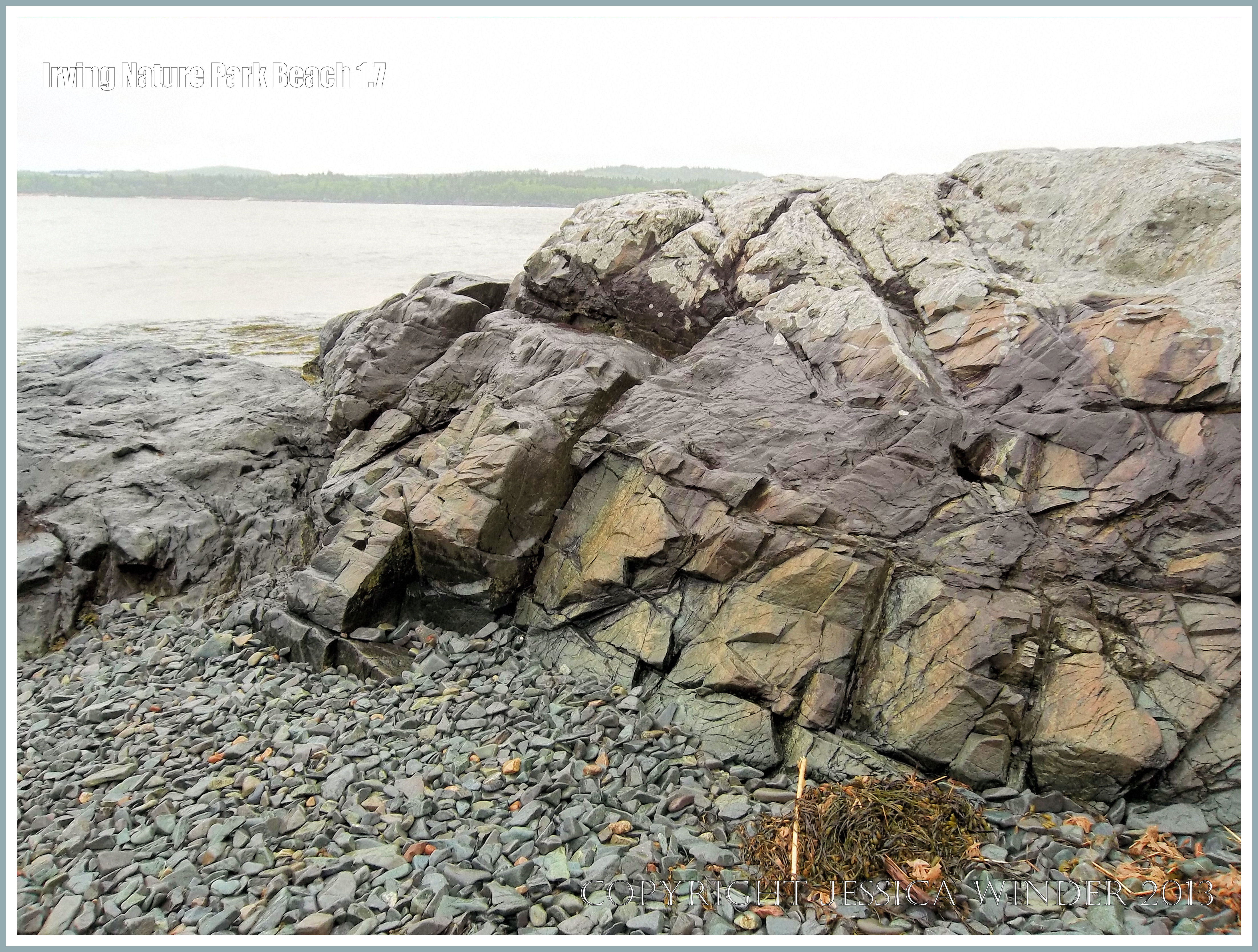 Irving Nature Park Beach 1.7 – Outcrop of Precambrian volcanic rock of the Taylor Island Formation (ZCTIvs) and beach stones at Irving Nature Park, New Brunswick, Canada