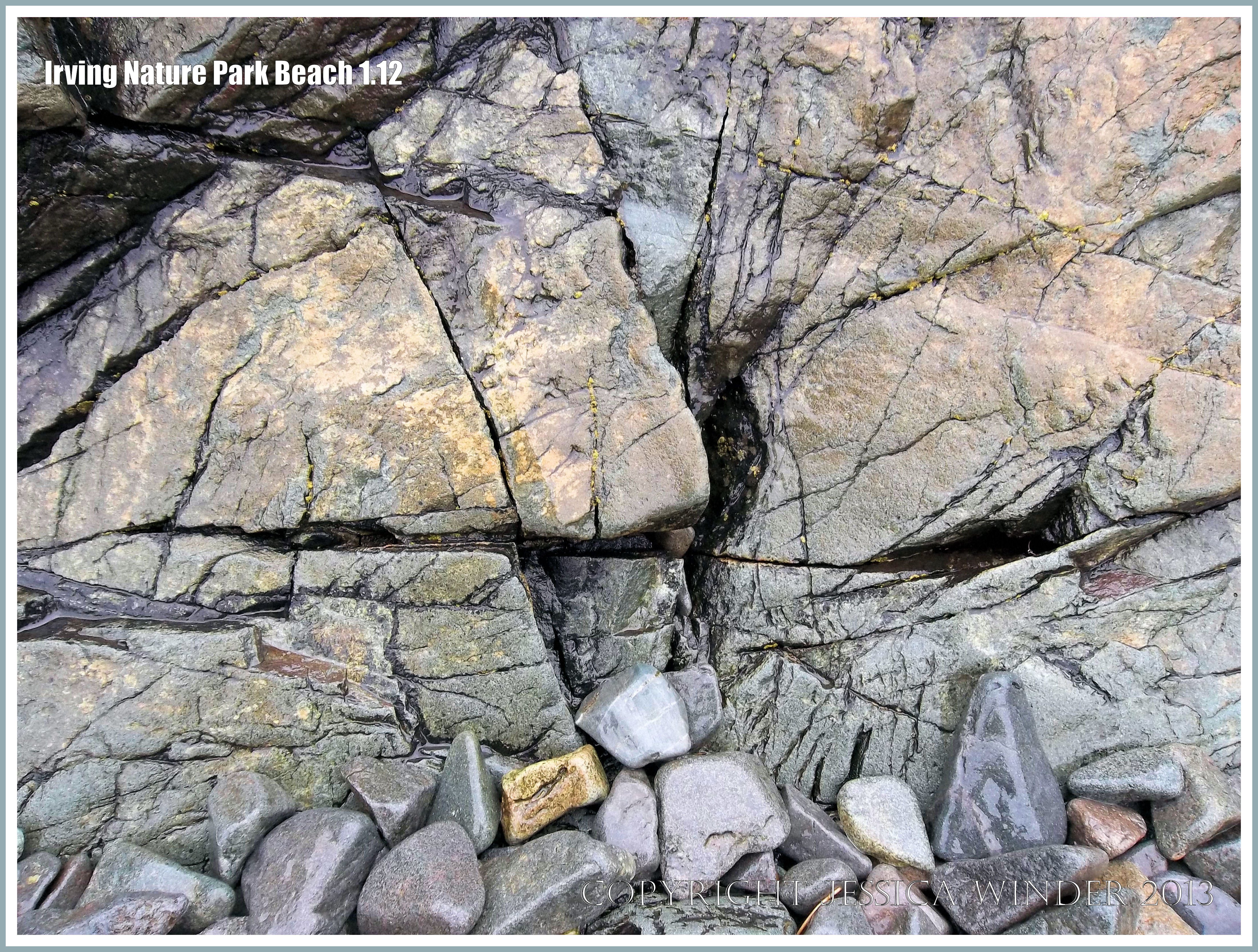 Irving Nature Park Beach 1.12 – Outcrop of Precambrian volcanic rock of the Taylor Island Formation (ZCTIvs) and beach stones at Irving Nature Park, New Brunswick, Canada