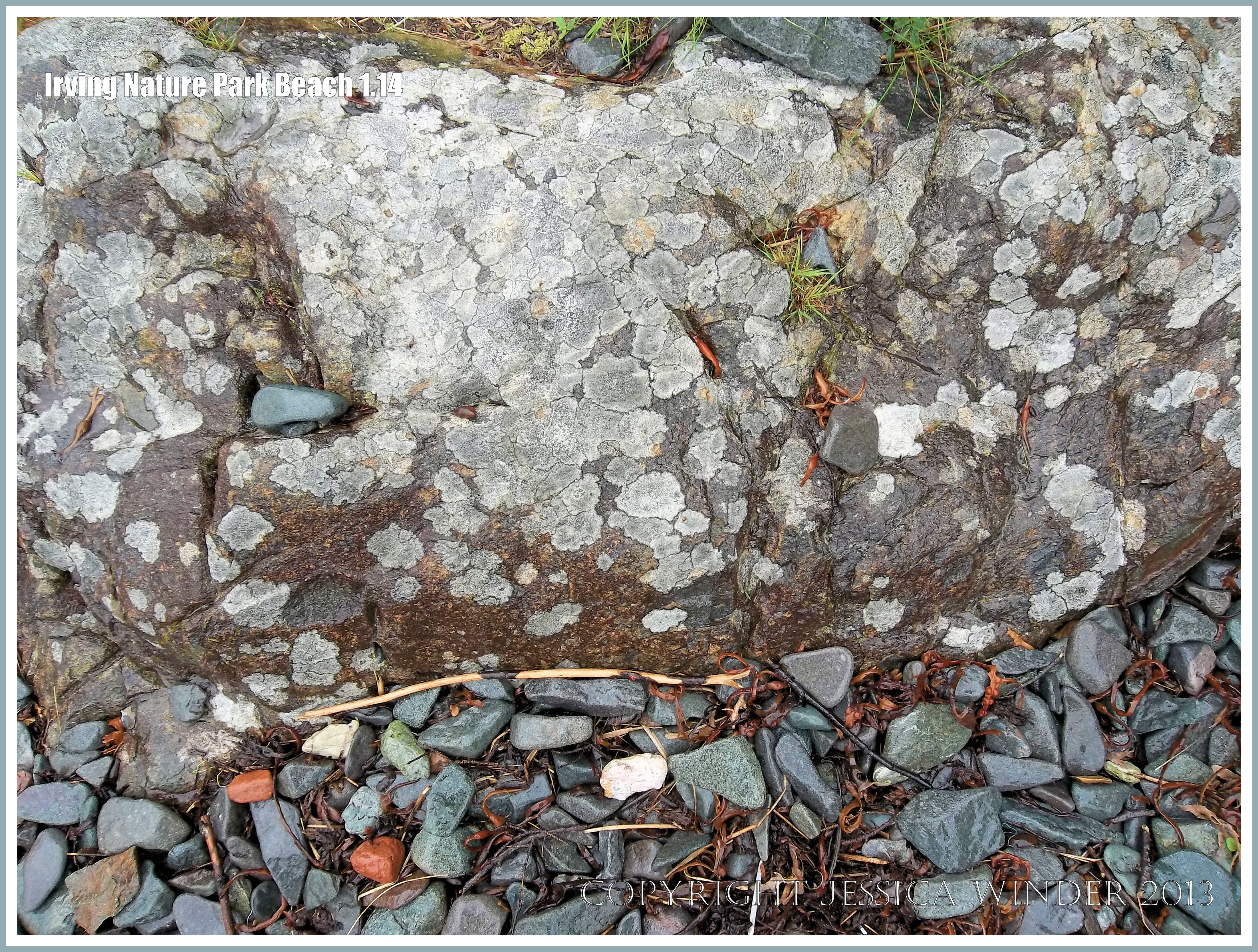 Irving Nature Park Beach 1.14 – Outcrop of Precambrian volcanic rock of the Taylor Island Formation (ZCTIvs) and beach stones at Irving Nature Park, New Brunswick, Canada