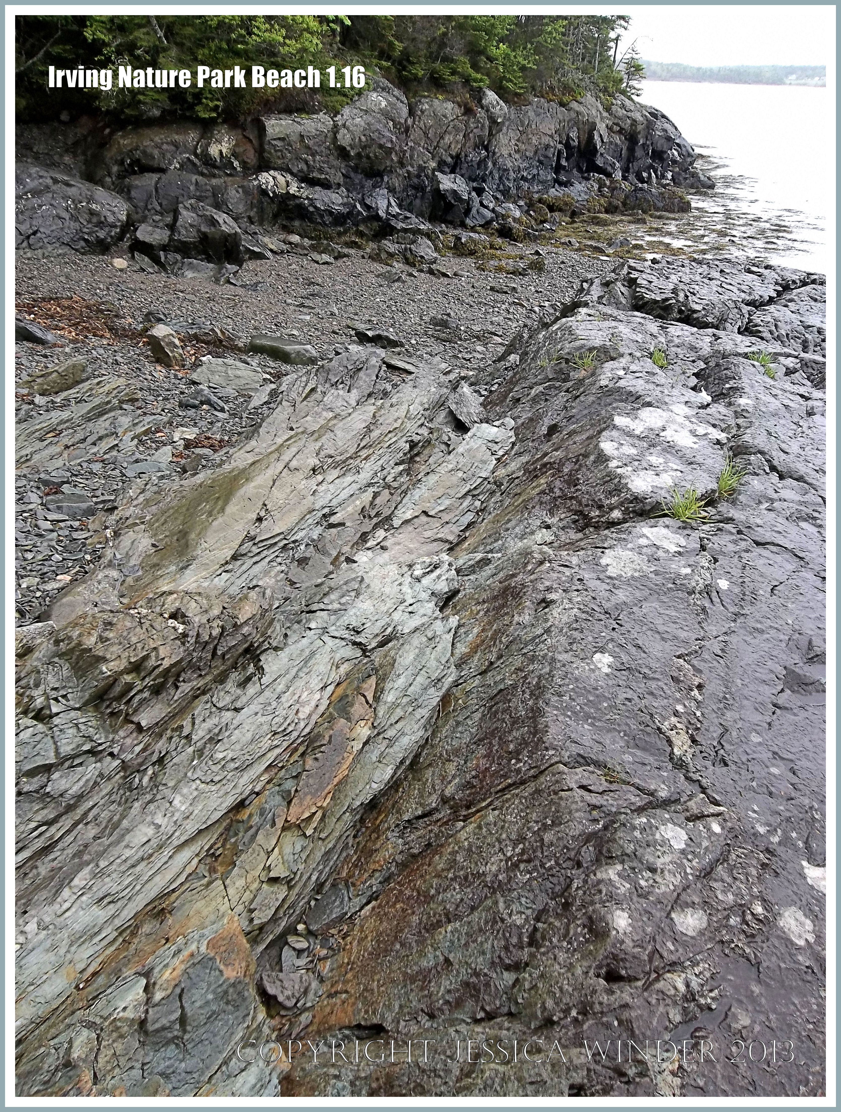 Irving Nature Park Beach 1.16 – Close-up of rock pattern and texture in PreCambrian volcanic rock of the Taylor Island Formation (ZCTIvs) on the beach at Irving Nature Park, New Brunswick, Canada.