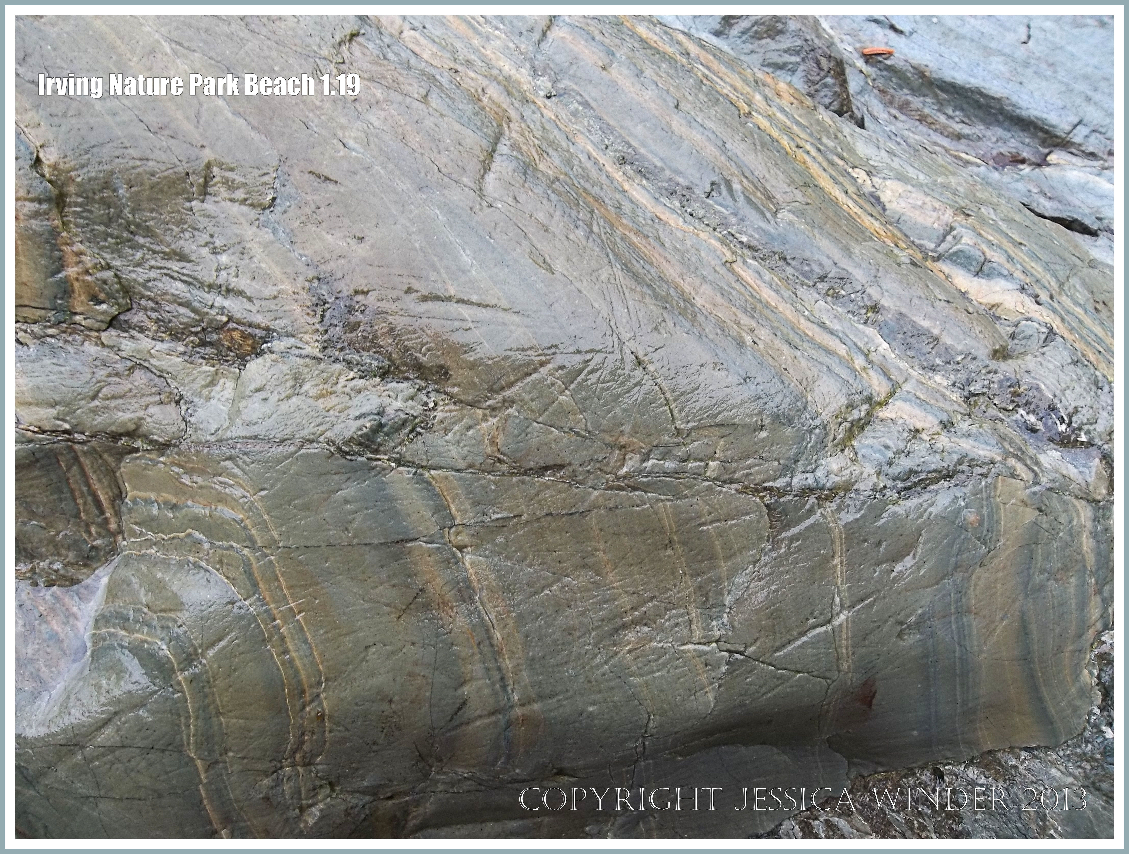 Irving Nature Park Beach 1.19 – Close-up of rock pattern and texture in PreCambrian volcanic rock of the Taylor Island Formation (ZCTIvs) on the beach at Irving Nature Park, New Brunswick, Canada.