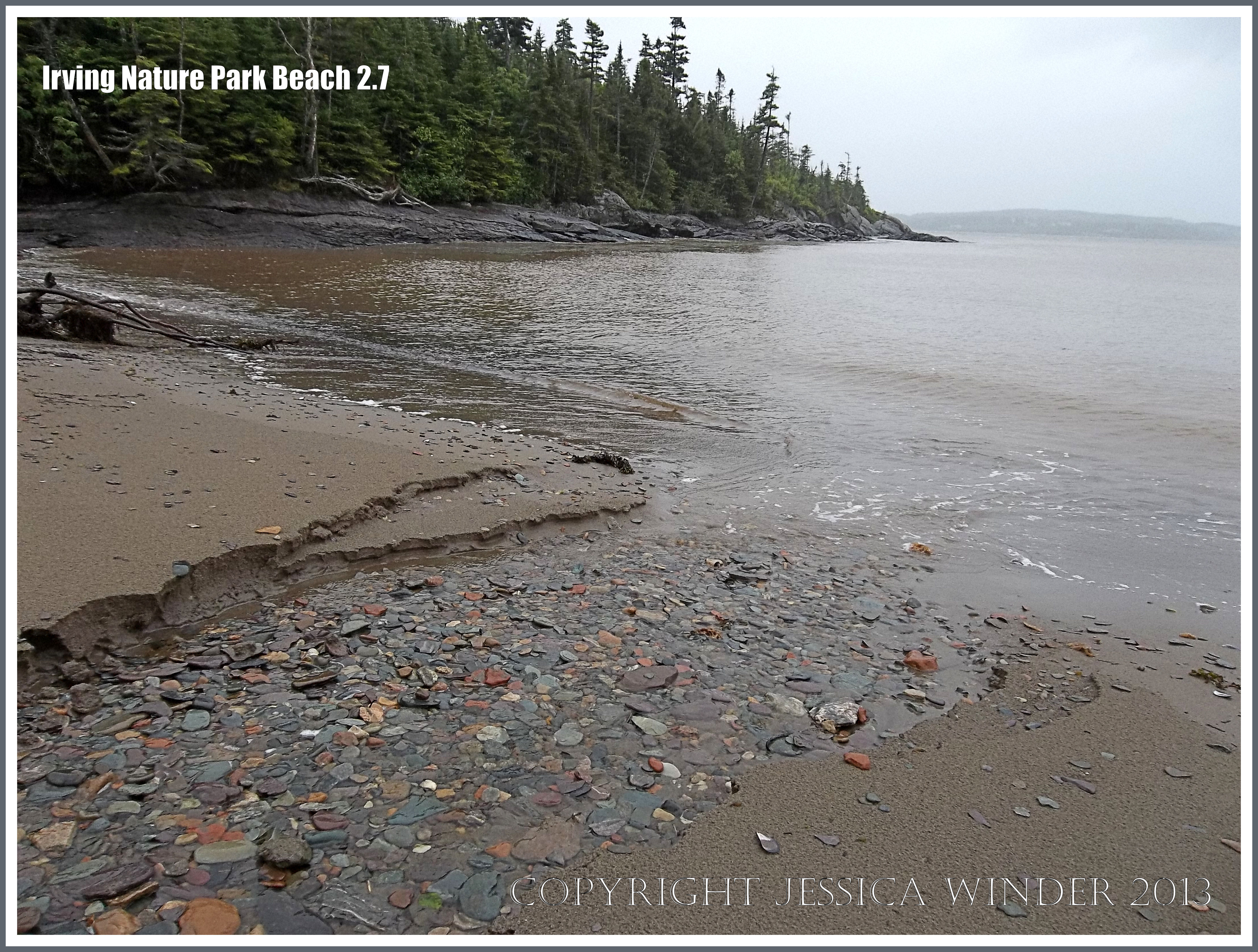 Irving Nature Park Beach 2.7 – Stream flowing over seashore revealing coloured beach stones at Irving Nature Park, New Brunswick, Canada.
