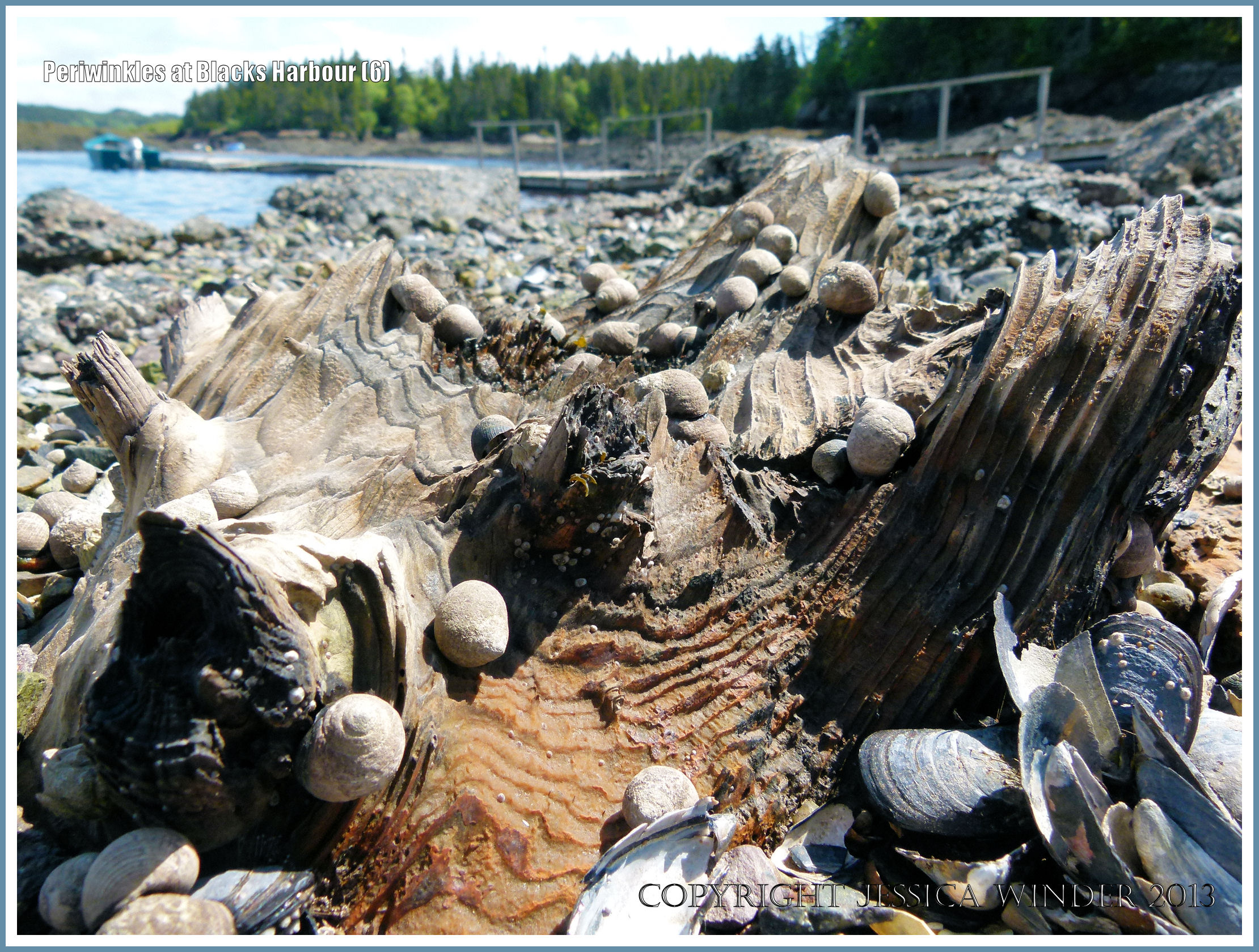 Periwinkles at Blacks Harbour 6 – Common Periwinkles (Littorina littorea Linnaeus) on the weathered wood of old pilings on the seashore at Blacks Harbour, New Brunswick, Canada.