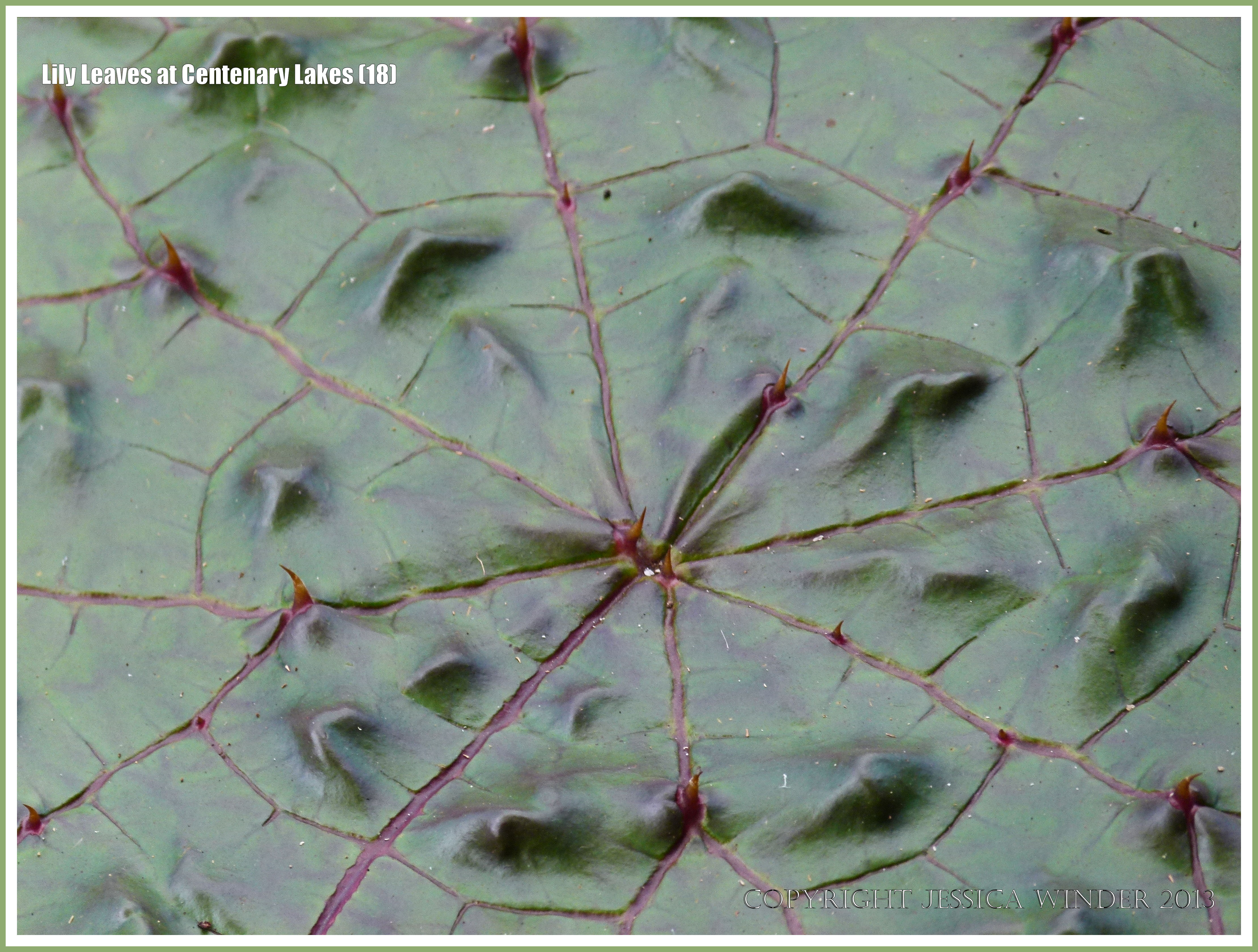 Lily Leaves at Centenary Lakes 19 – Close-up of the virtually smooth surface texture of a almost fully opened water lily leaf, with a pattern of red veins and red thorns, at Centenary Lakes in Cairns Botanic Gardens, Australia.