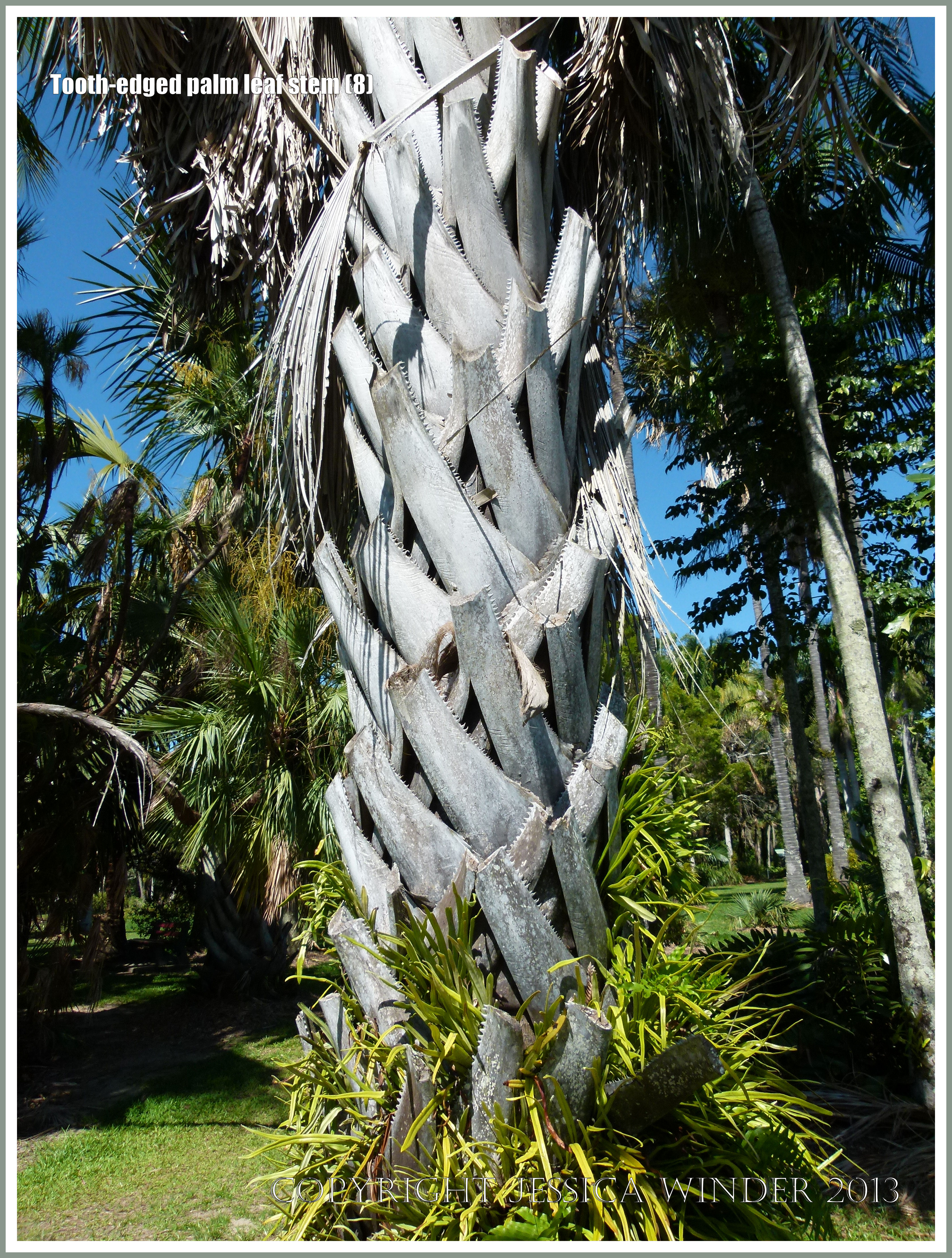 Tooth-edged palm leaf stem 8 – The sharp teeth on the edge of dead palm leaf stems still wrapped around the trunk of an unidentified palm tree in Cairns Botanic Gardens, Queensland, Australia.