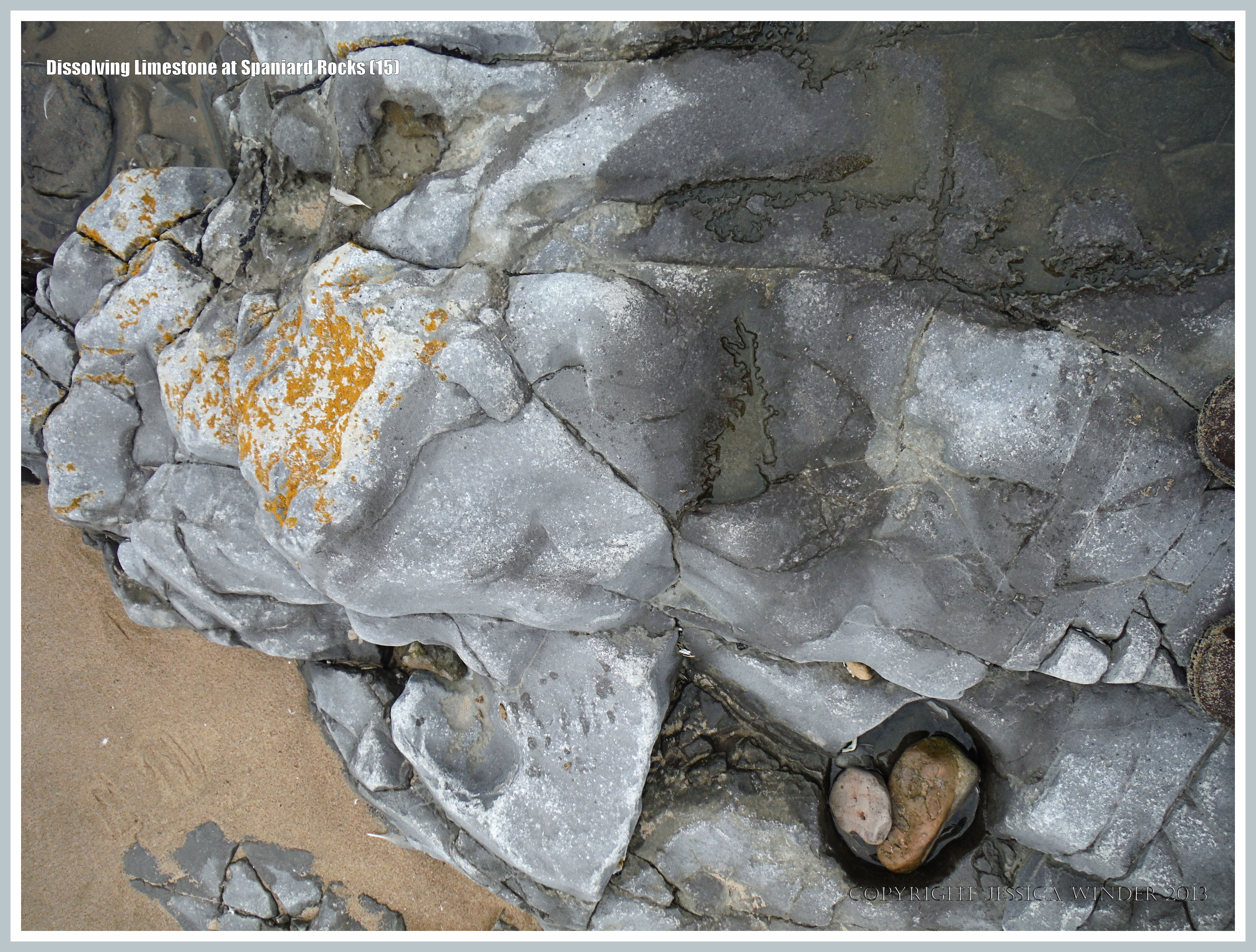 Dissolving Limestone at Spaniard Rocks 15 – Shallow water-filled depressions in Carboniferous Limestone showing acid etching patterns on the margins of the pools, Spaniard Rocks, Rhossili Bay, Gower Peninsula, South Wales.