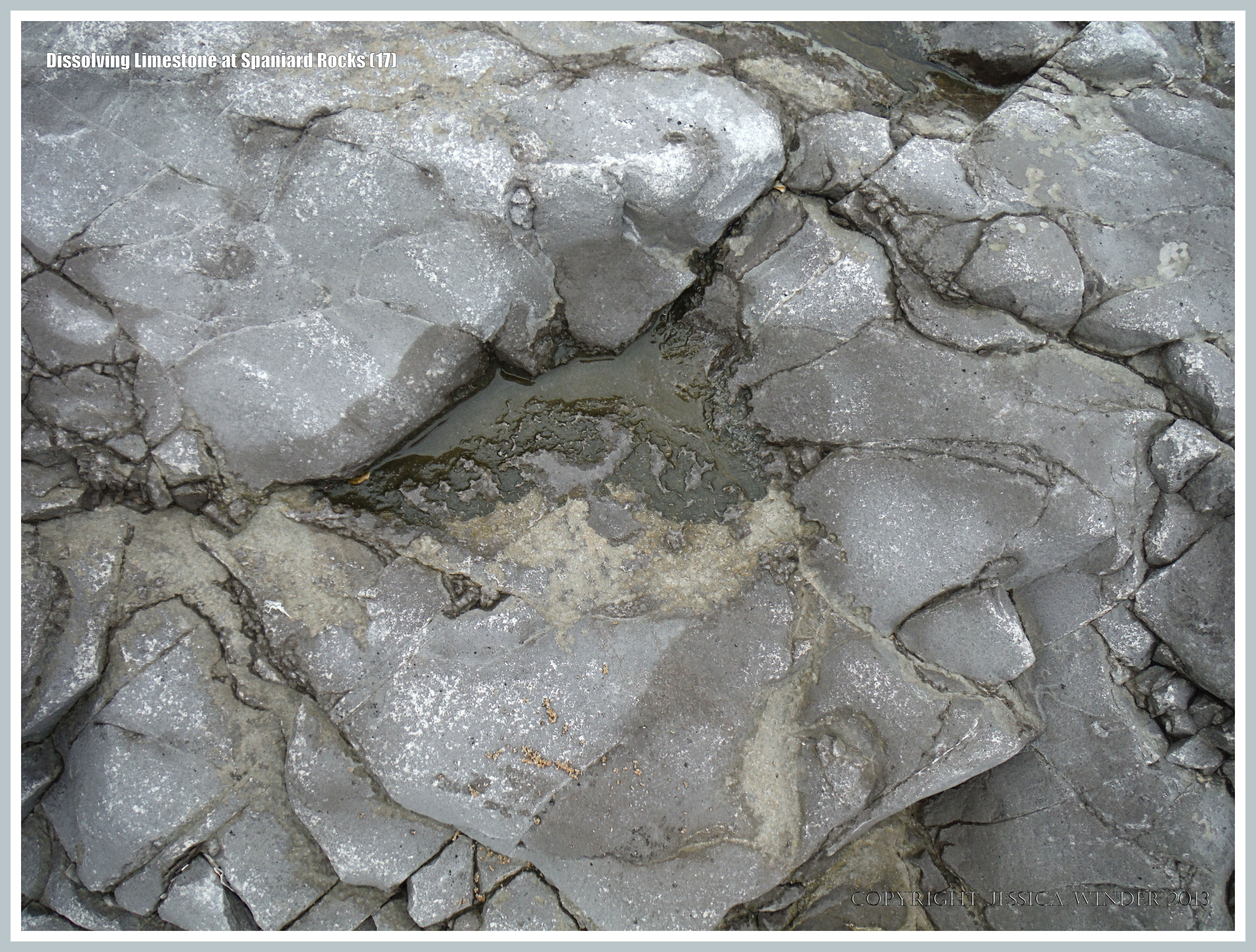 Dissolving Limestone at Spaniard Rocks 17 – Shallow water-filled depression in Carboniferous Limestone showing acid etching patterns on the margins of the pool, Spaniard Rocks, Rhossili Bay, Gower Peninsula, South Wales.