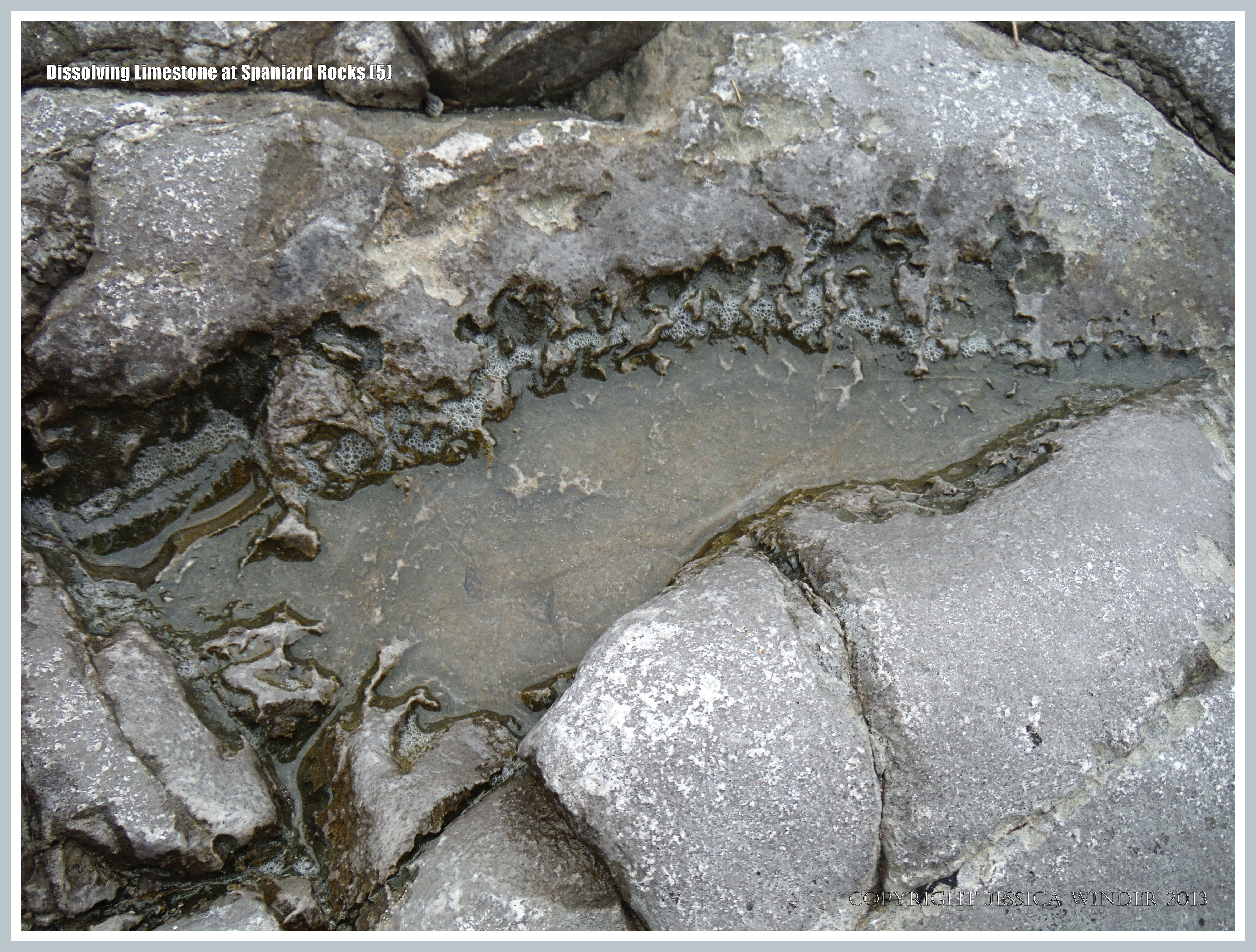 Dissolving Limestone at Spaniard Rocks 5 – Shallow water-filled depression in Carboniferous Limestone showing acid etching patterns on the margins of the pool at Spaniard Rocks, Rhossili Bay, Gower Peninsula, South Wales.
