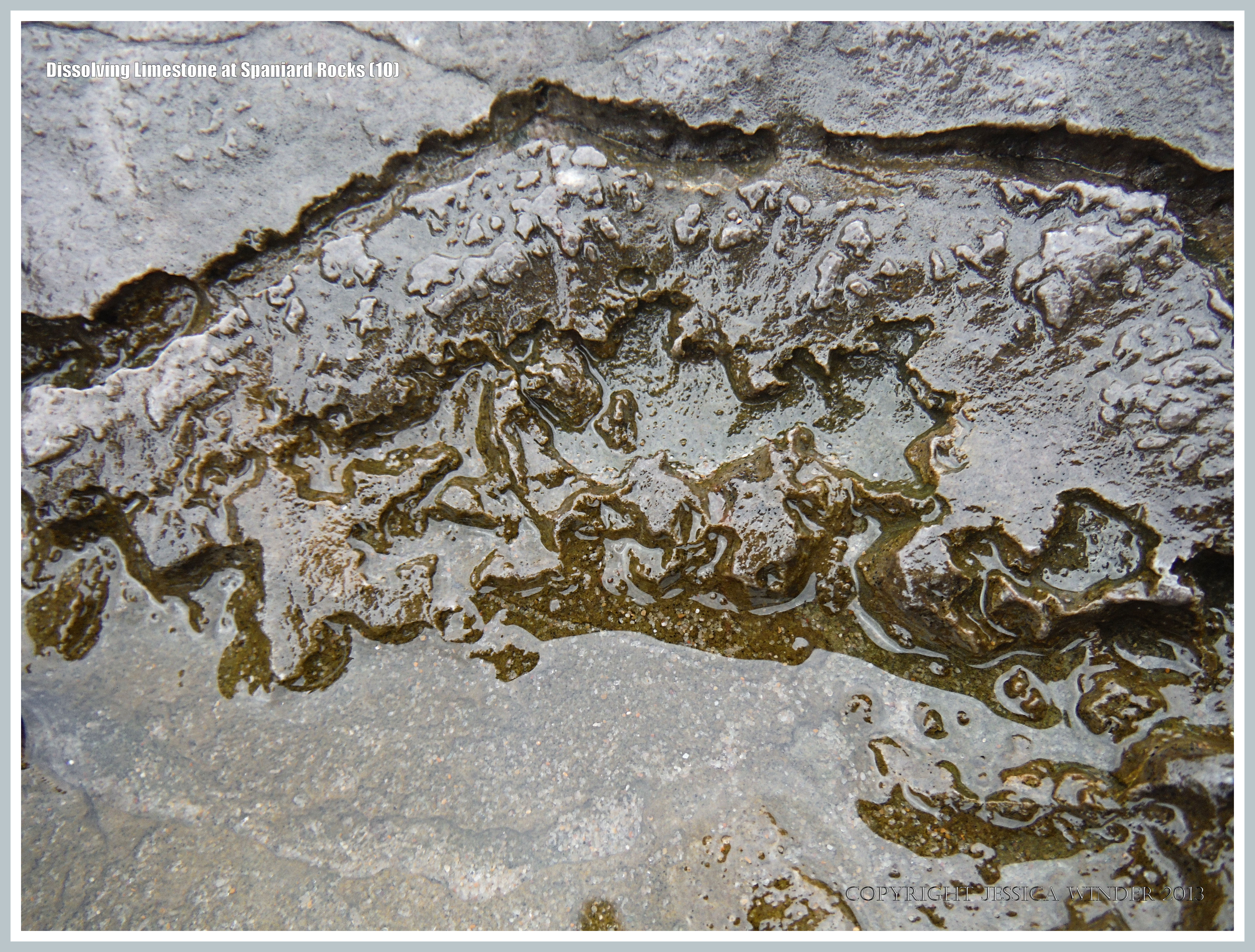 Close-up of the pattern etched by acid erosion into the edge of a shallow water-filled depression on the surface of Carboniferous Limestone outcrop on the beach