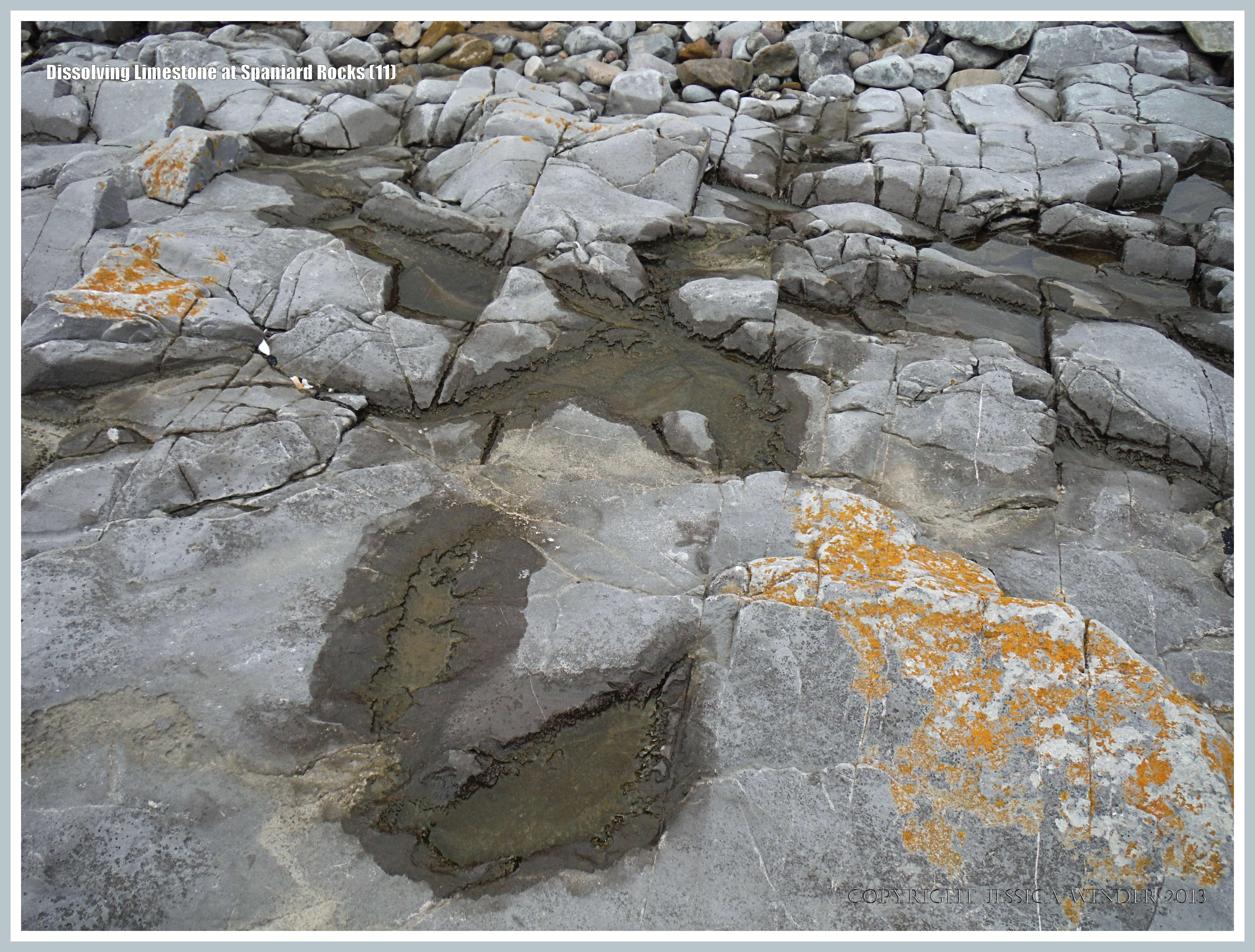 Dissolving Limestone at Spaniard Rocks 11 – Shallow water-filled depressions in Carboniferous Limestone showing acid etching patterns on the margins of the pools, Spaniard Rocks, Rhossili Bay, Gower Peninsula, South Wales.
