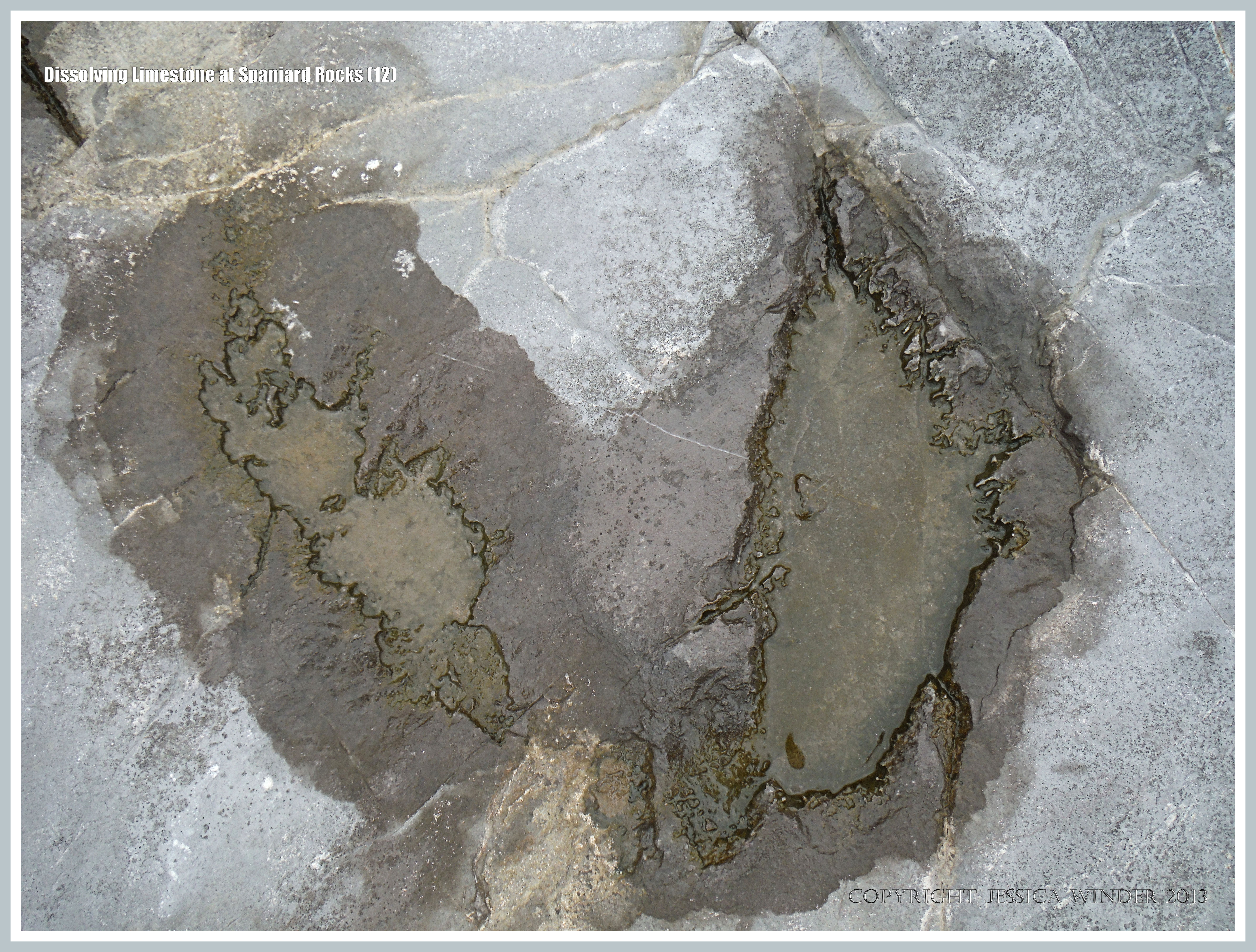 Dissolving Limestone at Spaniard Rocks 12 – Shallow water-filled depressions in Carboniferous Limestone showing acid etching patterns on the margins of the pools, Spaniard Rocks, Rhossili Bay, Gower Peninsula, South Wales.