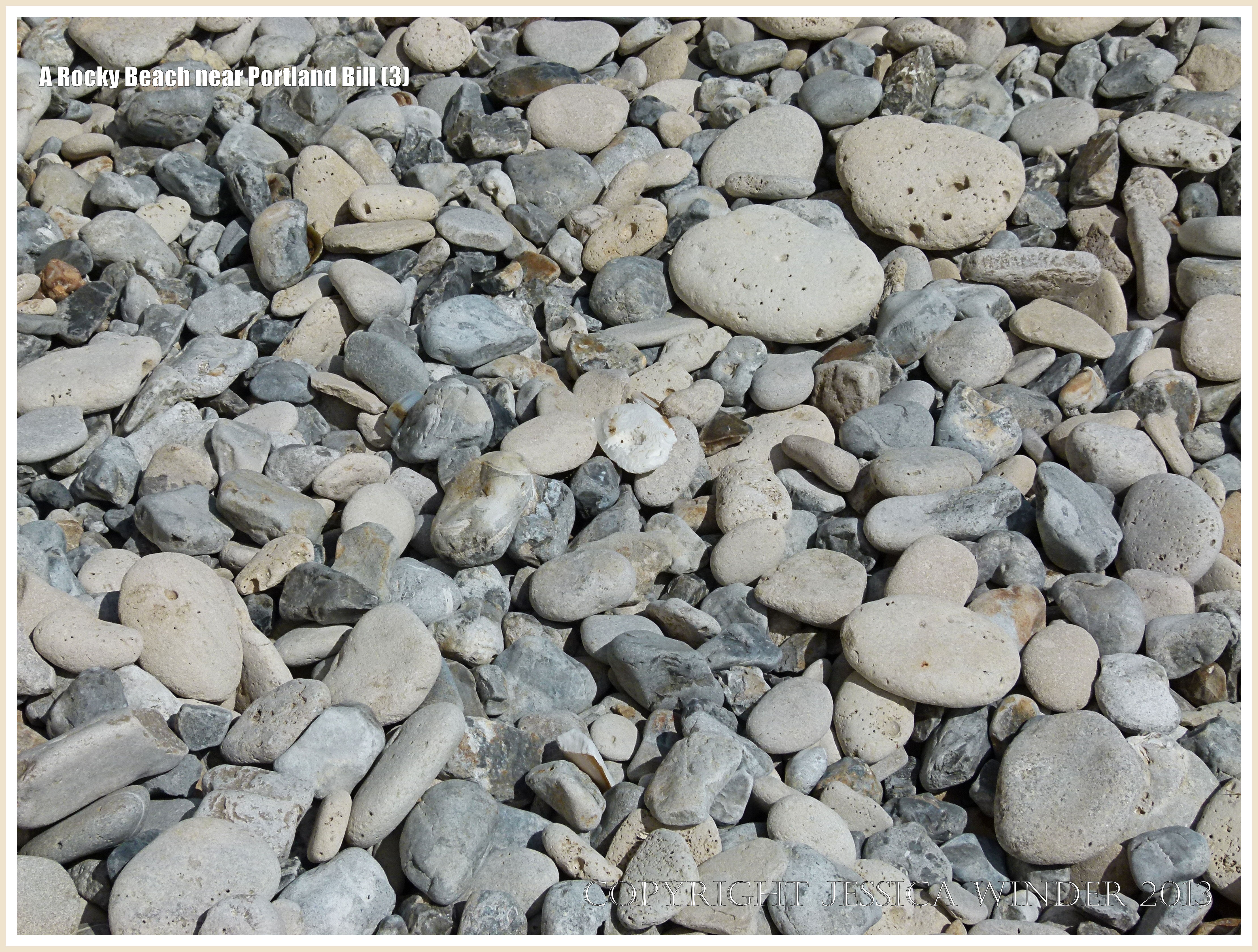 A Rocky Beach near Portland Bill 3 – Pebbles on the beach, including many with holes made by marine invertebrates, on the eastern shore of the Isle of Portland, Dorset, U.K.